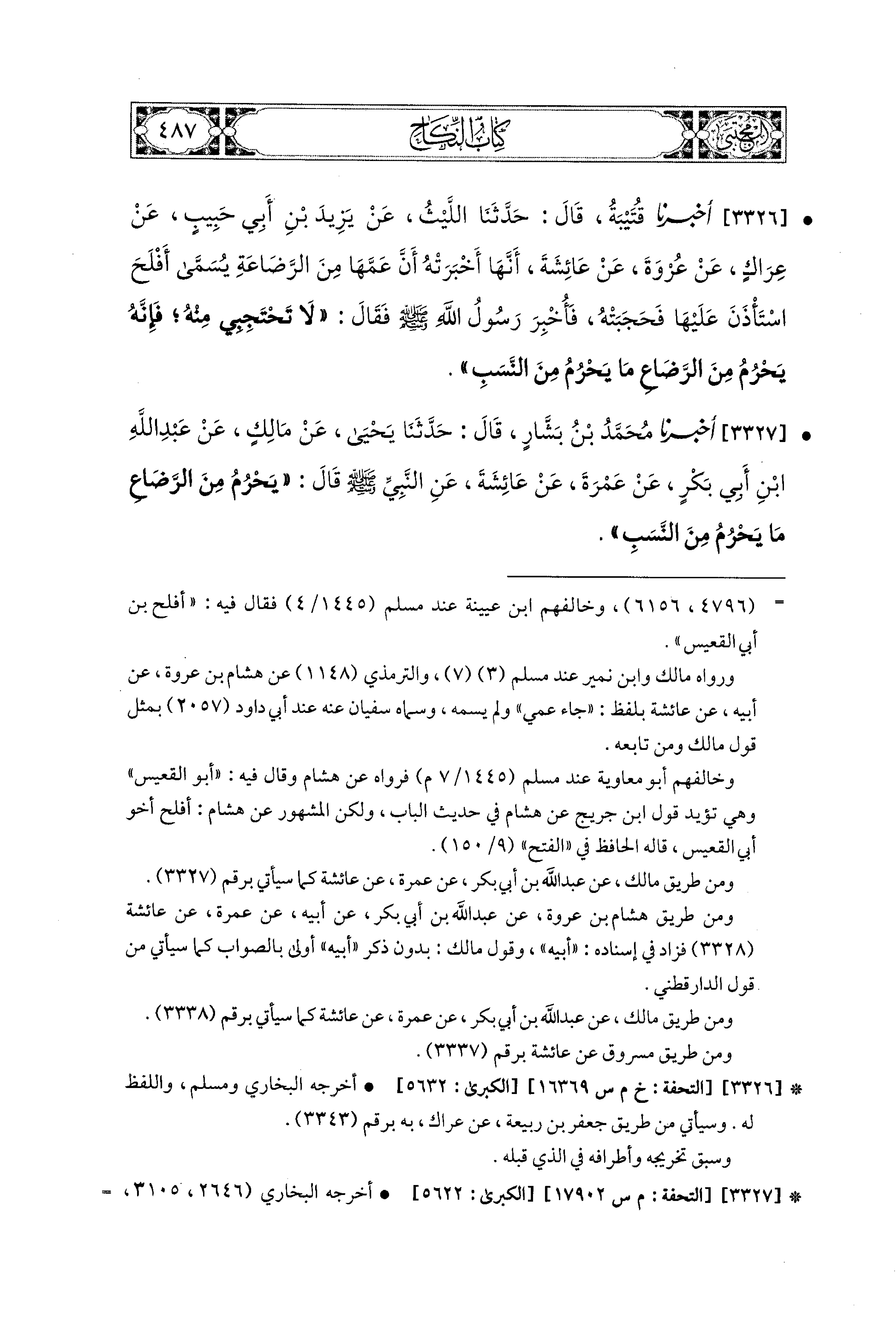 3326 - أَخبَرَنا قُتَيبَةُ، قال: حَدثنا اللَّيْثُ، عَن يَزِيدَ بْنِ أَبي حَبِيبٍ، عَن عِرَاكٍ، عَن عُرْوَةَ، عَن عَائِشَةَ، أَنَّهَا أَخْبَرَتْهُ أَنَّ عَمَّهَا مِنَ الرَّضَاعَةِ، يُسَمَّى أَفْلَحَ، اسْتَأْذَنَ عَلَيهَا فَحَجَبَتْهُ، فَأُخْبِرَ رَسُولُ اللهِ صَلى الله عَليه وسَلم فَقَالَ: لاَ تَحْتَجِبِي مِنْهُ، فَإِنَّهُ يَحْرُمُ مِنَ الرَّضَاعِ مَا يَحْرُمُ مِنَ النَّسَبِ.