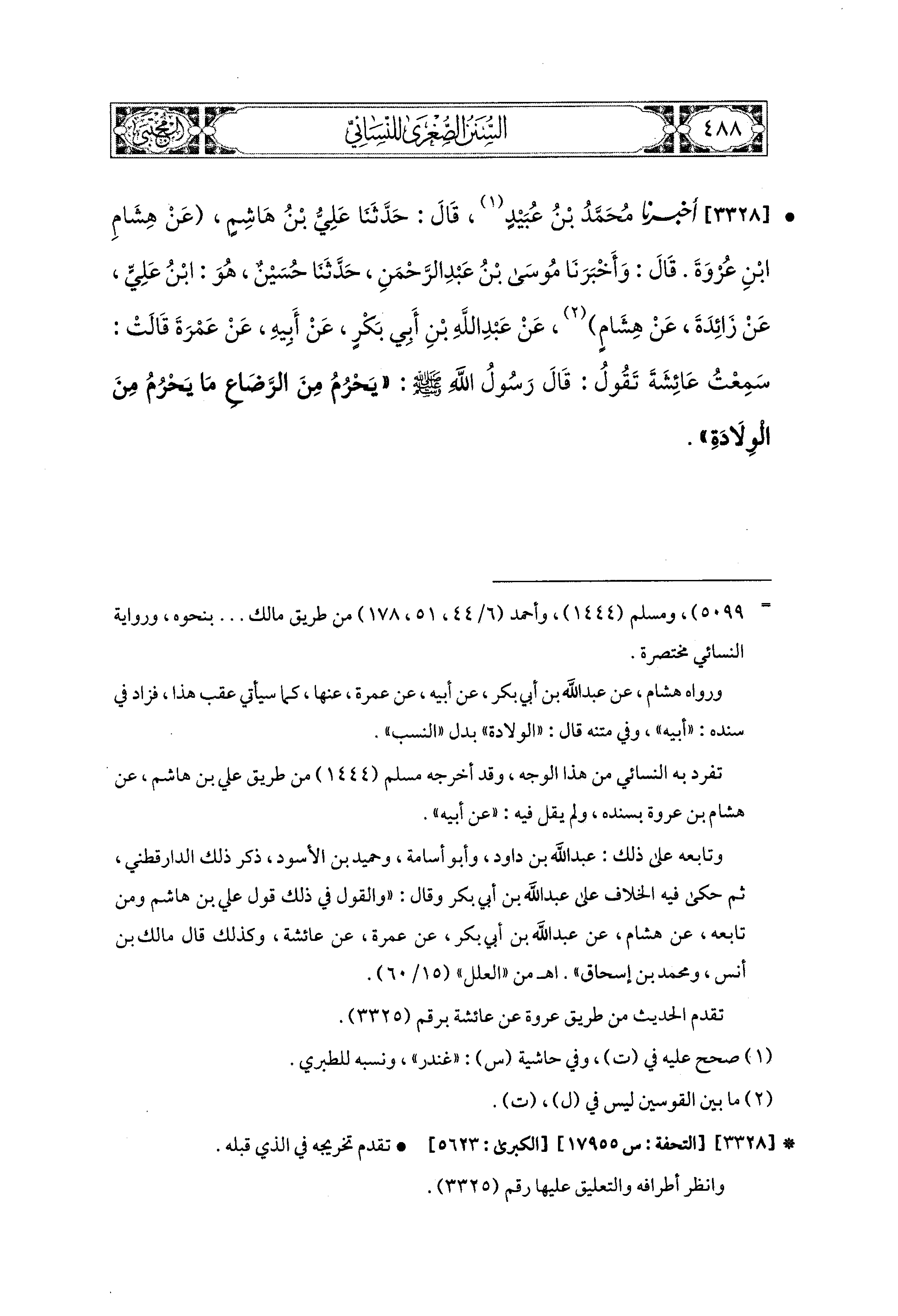 3328 - أَخبَرَنا مُحَمد بْنُ عُبَيدٍ، قال: حَدثنا عَلِيُّ بْنُ هَاشِمٍ، عَن هِشَامِ بْنِ عُرْوَةَ (1)، قال: وأَخبَرَنا موسى بْنُ عبد الرحمن حَدثنا حسين هُوَ ابن علي عَن زائدة عَن هشام عَن عَبد اللهِ بن أَبي بَكْرٍ، عَن أَبيهِ، عَن عَمْرَةَ، قَالَتْ: سَمِعْتُ عَائِشَةَ، تَقُولُ: قَالَ رَسُولُ اللهِ صَلى الله عَليه وسَلم: يَحْرُمُ مِنَ الرَّضَاعِ مَا يَحْرُمُ مِنَ الوِلاَدَةِ.