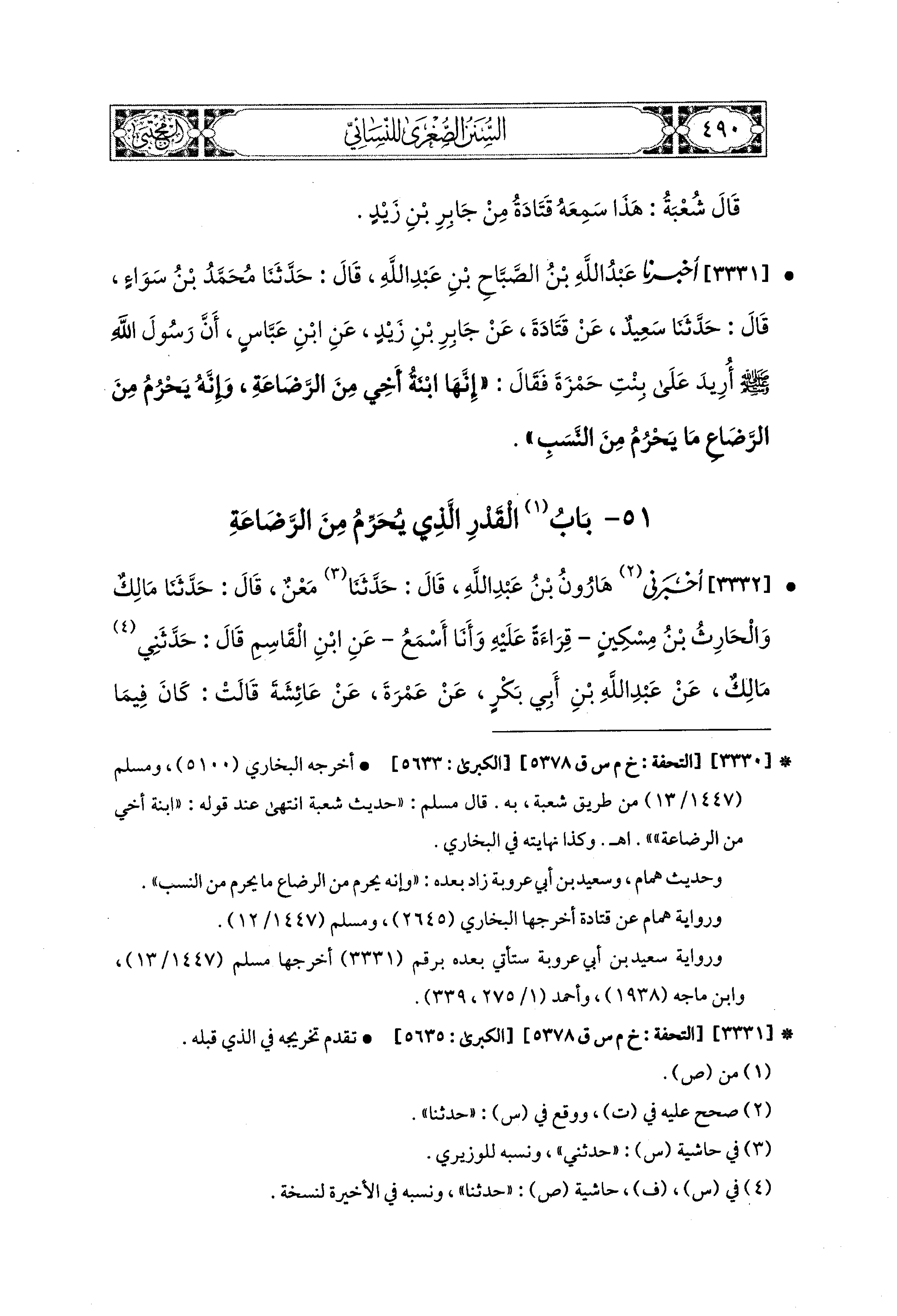 3331 - أَخبَرَنا عَبدُ اللهِ بْنُ الصَّبَّاحِ بْنِ عَبدِ اللهِ، قال: حَدثنا مُحَمدُ بْنُ سَوَاءٍ، قال: حَدثنا سَعيدٌ، عَن قَتَادَةَ، عَن جَابِرِ بْنِ زَيْدٍ، عَنِ ابنِ عَبَّاسٍ، أَنَّ رَسُولَ اللهِ صَلى الله عَليه وسَلم أُرِيدَ عَلَى بِنْتِ حَمْزَةَ، فَقَالَ: إِنَّهَا ابنَةُ أَخِي مِنَ الرَّضَاعَةِ، وَإِنَّهُ يَحْرُمُ مِنَ الرَّضَاعِ مَا يَحْرُمُ مِنَ النَّسَبِ.