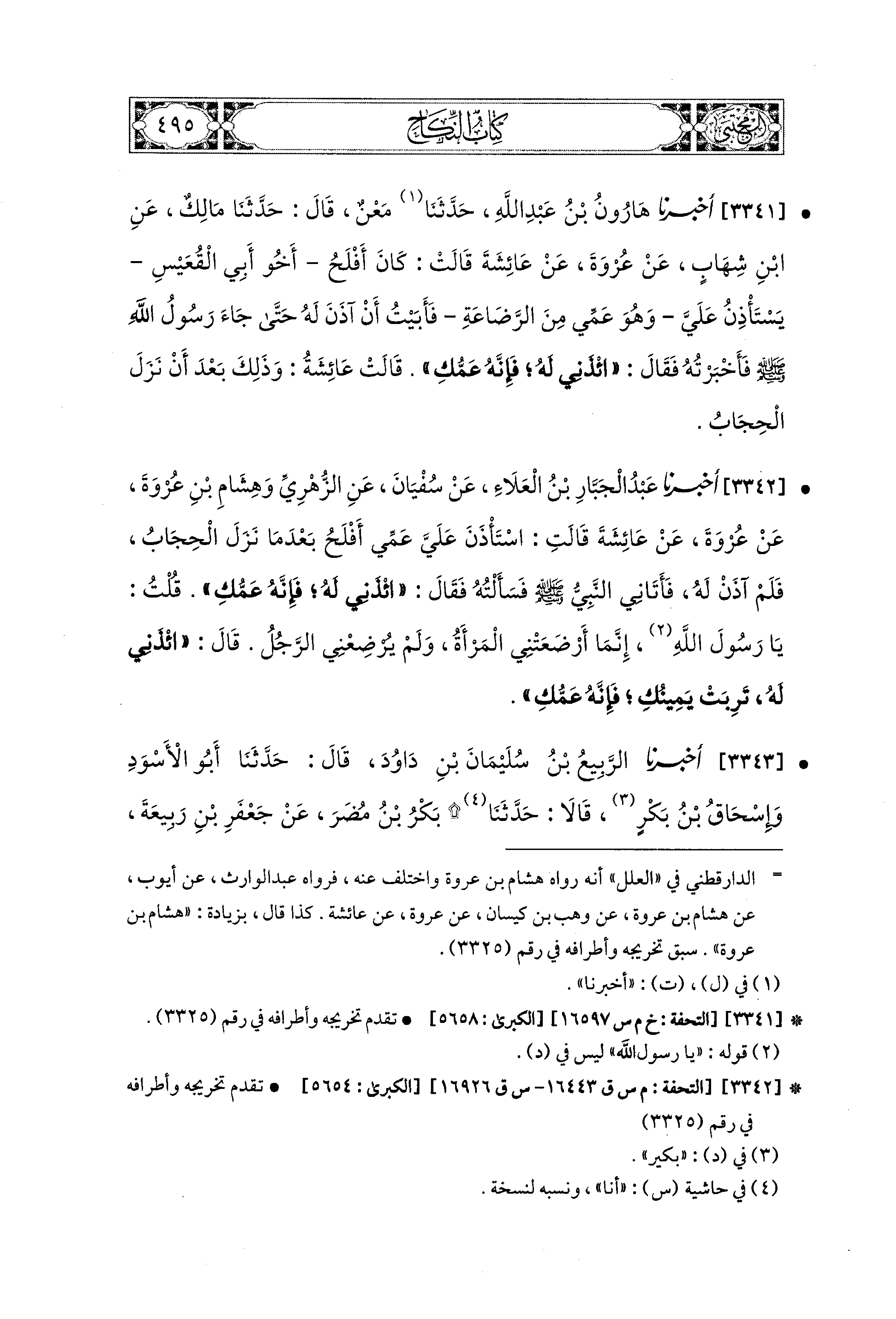 3342 - أَخبَرَنا عَبدُ الجَبَّارِ بْنُ العَلاَءِ، عَن سُفيَانَ، عَنِ الزُّهْرِيِّ، وَهِشَامُ بْنُ عُرْوَةَ، عَن عُرْوَةَ، عَن عَائِشَةَ، قَالَتْ: اسْتَأْذَنَ عَلَيَّ عَمِّي أَفْلَحُ بَعْدَ مَا نَزَلَ الحِجَابُ، فَلَمْ آذَنْ لَهُ، فَأَتَاني النَّبيُّ صَلى الله عَليه وسَلم فَسَأَلْتُهُ، فَقَالَ: ائْذَني لَهُ فَإِنَّهُ عَمُّكِ، قُلْتُ: يَا رَسُولَ اللهِ، إِنَّمَا أَرْضَعَتْني المَرْأَةُ وَلَمْ يُرْضِعْني الرَّجُلُ، قَالَ: ائْذَني لَهُ، تَرِبَتْ يَمينُكِ فَإِنَّهُ عَمُّكِ.
