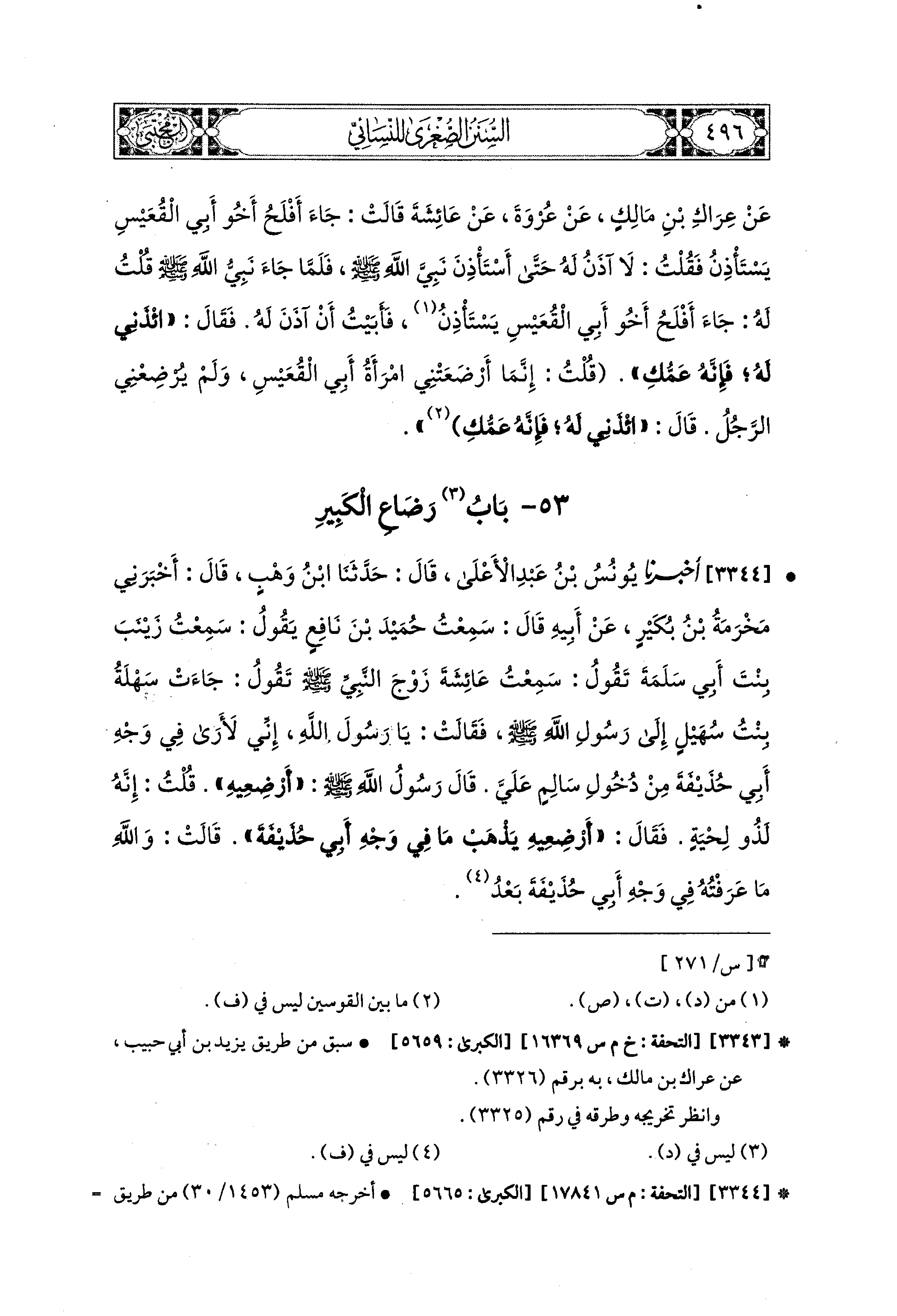 3344 - أَخبَرَنا يُونُسُ بن عَبدِ الأَعلَى، قال: حَدثنا ابنُ وَهْبٍ، قَالَ: أَخبَرني مَخْرَمَةُ بْنُ بُكَيْرٍ، عَن أَبيهِ، قَالَ: سَمِعْتُ حُمَيدَ بْنَ نَافِعٍ، يَقُولُ: سَمِعْتُ زَيْنَبَ بِنْتَ أَبي سَلَمَةَ، تَقُولُ: سَمِعْتُ عَائِشَةَ، زَوْجَ النَّبيِّ صَلى الله عَليه وسَلم تَقُولُ: جَاءَتْ سَهْلَةُ بِنْتُ سُهَيْلٍ إِلَى رَسُولِ اللهِ صَلى الله عَليه وسَلم، فَقَالَتْ: يَا رَسُولَ اللهِ، إِنِّي لأَرَى فِي وَجْهِ أَبي حُذَيفَةَ مِنْ دُخُولِ سَالِمٍ عَلَيَّ، قَالَ رَسُولُ اللهِ صَلى الله عَليه وسَلم: أَرْضِعِيهِ، قُلْتُ: إِنَّهُ لَذُو لِحْيَةٍ، فَقَالَ: أَرْضِعِيهِ يَذْهَبْ مَا فِي وَجْهِ أَبي حُذَيفَةَ، قَالَتْ: وَالله مَا عَرَفْتُهُ فِي وَجْهِ أَبي حُذَيفَةَ بَعْدُ.