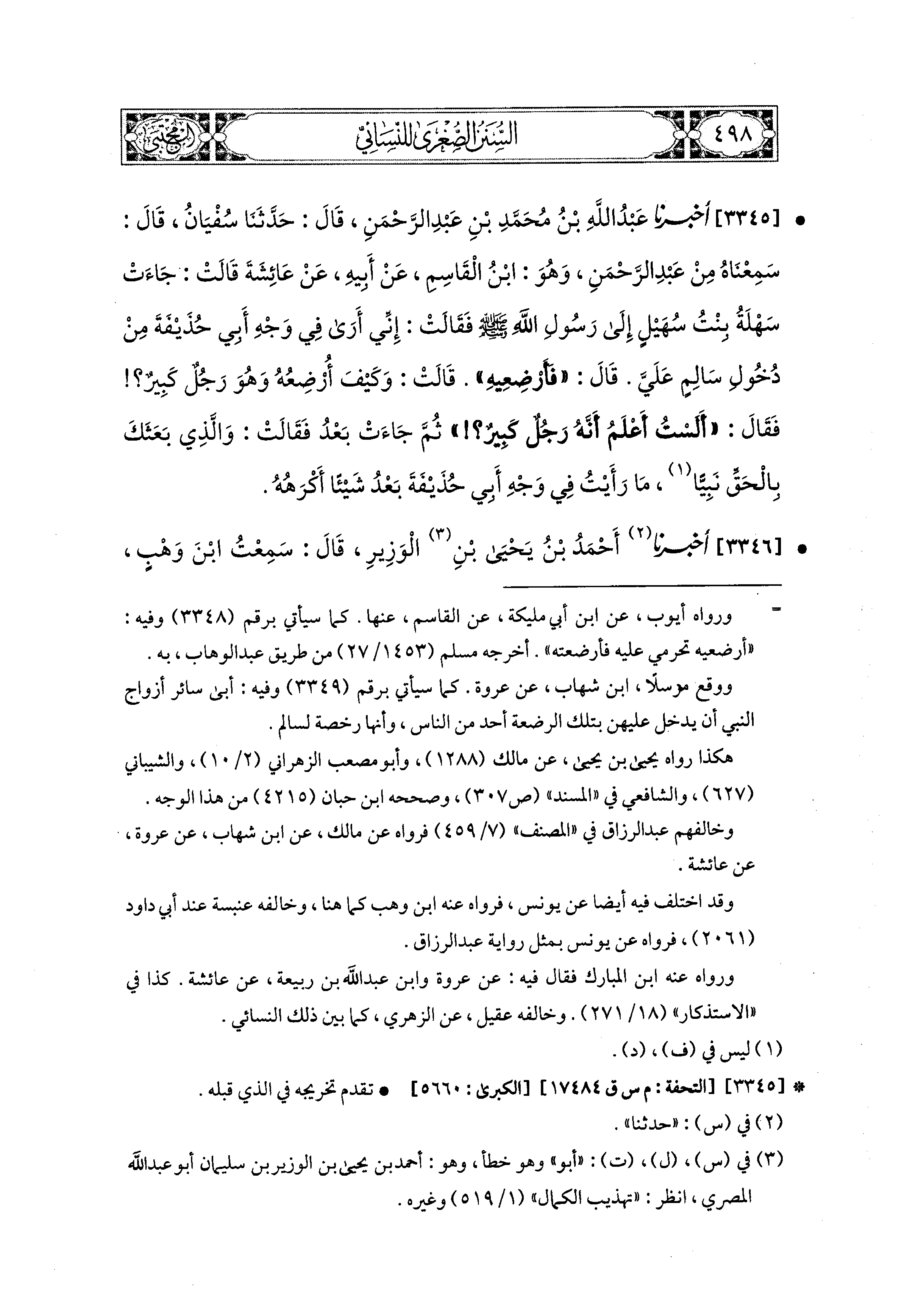 3345 - أَخبَرَنا عَبدُ اللهِ بْنُ مُحَمدِ بْنِ عَبدِ الرَّحمَنِ، قال: حَدثنا سُفيَانُ، قَالَ: سَمِعْنَاهُ مِنْ عَبدِ الرَّحمَنِ، وَهُوَ ابنُ القَاسِمِ، عَن أَبيهِ، عَن عَائِشَةَ، قَالَتْ: جَاءَتْ سَهْلَةُ بِنْتُ سُهَيْلٍ إِلَى رَسُولِ اللهِ صَلى الله عَليه وسَلم، فَقَالَتْ: إِنِّي أَرَى فِي وَجْهِ أَبي حُذَيفَةَ مِنْ دُخُولِ سَالِمٍ عَلَيَّ، قَالَ: فَأَرْضِعِيهِ، قَالَتْ: وَكَيْفَ أُرْضِعُهُ وَهُوَ رَجُلٌ كَبِيرٌ؟ فَقَالَ: أَلَسْتُ أَعْلَمُ أَنَّهُ رَجُلٌ كَبِيرٌ، ثُمَّ جَاءَتْ بَعْدُ فَقَالَتْ: وَالَّذِي بَعَثَكَ بِالحَقِّ نَبِيًّا، مَا رَأَيْتُ فِي وَجْهِ أَبي حُذَيفَةَ بَعْدُ شَيْئًا أَكْرَهُ.
