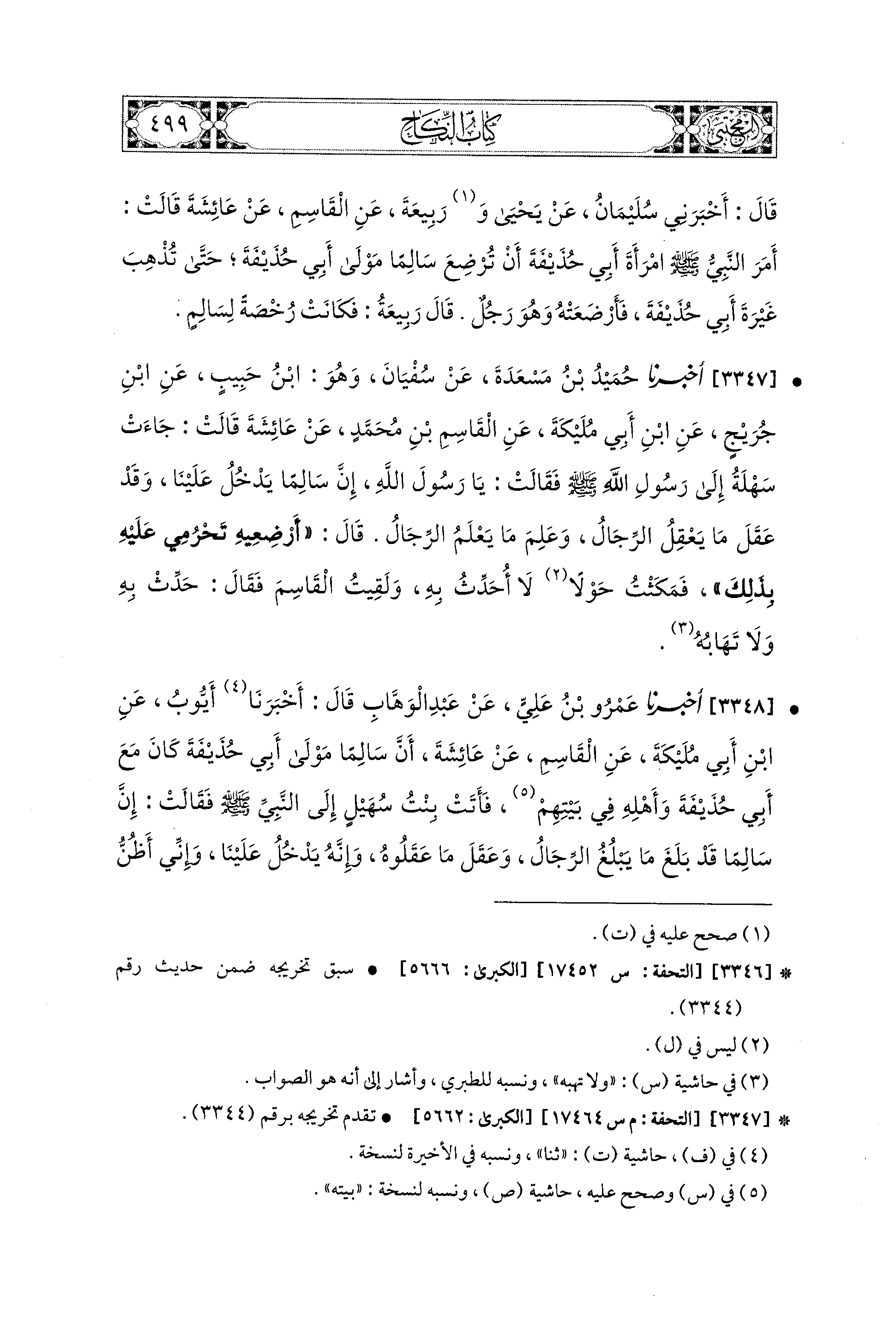 3348 - أَخبَرَنا عَمْرُو بْنُ عَلِيٍّ، عَن عَبدِ الوَهَّابِ، قَالَ: أَخبَرنا أَيُّوبُ، عَنِ ابنِ أَبي مُلَيْكَةَ، عَنِ القَاسِمِ، عَن عَائِشَةَ؛ أَنَّ سَالِمًا مَوْلَى أَبي حُذَيفَةَ كَانَ مَعَ أَبي حُذَيفَةَ وَأَهْلِهِ فِي بَيْتِهِمْ، فَأَتَتْ بِنْتُ سُهَيْلٍ إِلَى النَّبيِّ صَلى الله عَليه وسَلم فَقَالَتْ: إِنَّ سَالِمًا قَدْ بَلَغَ مَا يَبْلُغُ الرِّجَالُ، وَعَقَلَ مَا عَقَلُوهُ، وَإِنَّهُ يَدْخُلُ عَلَيْنَا، وَإِنِّي أَظُنُّ فِي نَفْسِ أَبي حُذَيفَةَ مِنْ ذَلِكَ شَيْئًا، فَقَالَ النَّبيُّ صَلى الله عَليه وسَلم: أَرْضِعِيهِ تَحْرُمي عَلَيهِ، فَأَرْضَعْتُهُ، فَذَهَبَ الَّذِي فِي نَفْسِ أَبي حُذَيفَةَ، فَرَجَعْتُ إِلَيْهِ، فَقُلْتُ: إِنِّي قَدْ أَرْضَعْتُهُ، فَذَهَبَ الَّذِي فِي نَفْسِ أَبي حُذَيفَةَ.
