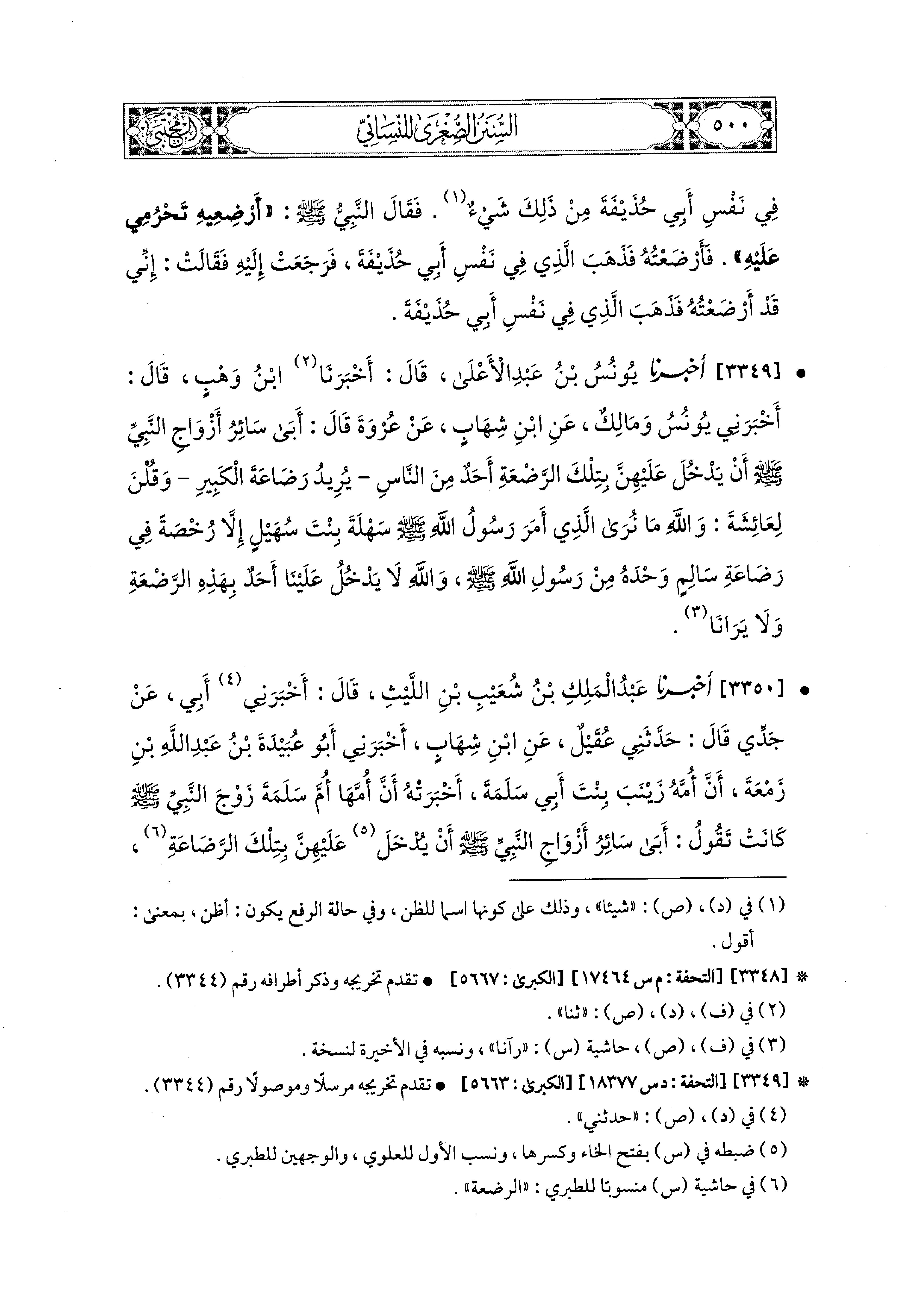 3349 - أَخبَرَنا يُونُسُ بن عَبدِ الأَعلَى، قَالَ: أَخبَرنا ابنُ وَهْبٍ، قَالَ: أَخبَرني يُونُسُ، وَمَالِكٌ، عَنِ ابنِ شِهَابٍ، عَن عُرْوَةَ، قَالَ: أَبَى سَائِرُ أَزْوَاجِ النَّبيِّ صَلى الله عَليه وسَلم أَنْ يَدْخُلَ عَلَيهِنَّ بِتِلْكَ الرَّضْعَةِ أَحَدٌ مِنَ النَّاسِ يُرِيدُ رَضَاعَةَ الكَبِيرِ، وَقُلْنَ لِعَائِشَةَ: وَالله مَا نُرَى الَّذِي أَمَرَ رَسُولُ اللهِ صَلى الله عَليه وسَلم سَهْلَةَ بِنْتَ سُهَيْلٍ، إِلاَّ رُخْصَةً فِي رَضَاعَةِ سَالِمٍ وَحْدَهُ مِنْ رَسُولِ اللهِ صَلى الله عَليه وسَلم، وَالله لاَ يَدْخُلُ عَلَيْنَا أَحَدٌ بِهَذِهِ الرَّضْعَةِ وَلاَ يَرَانَا.