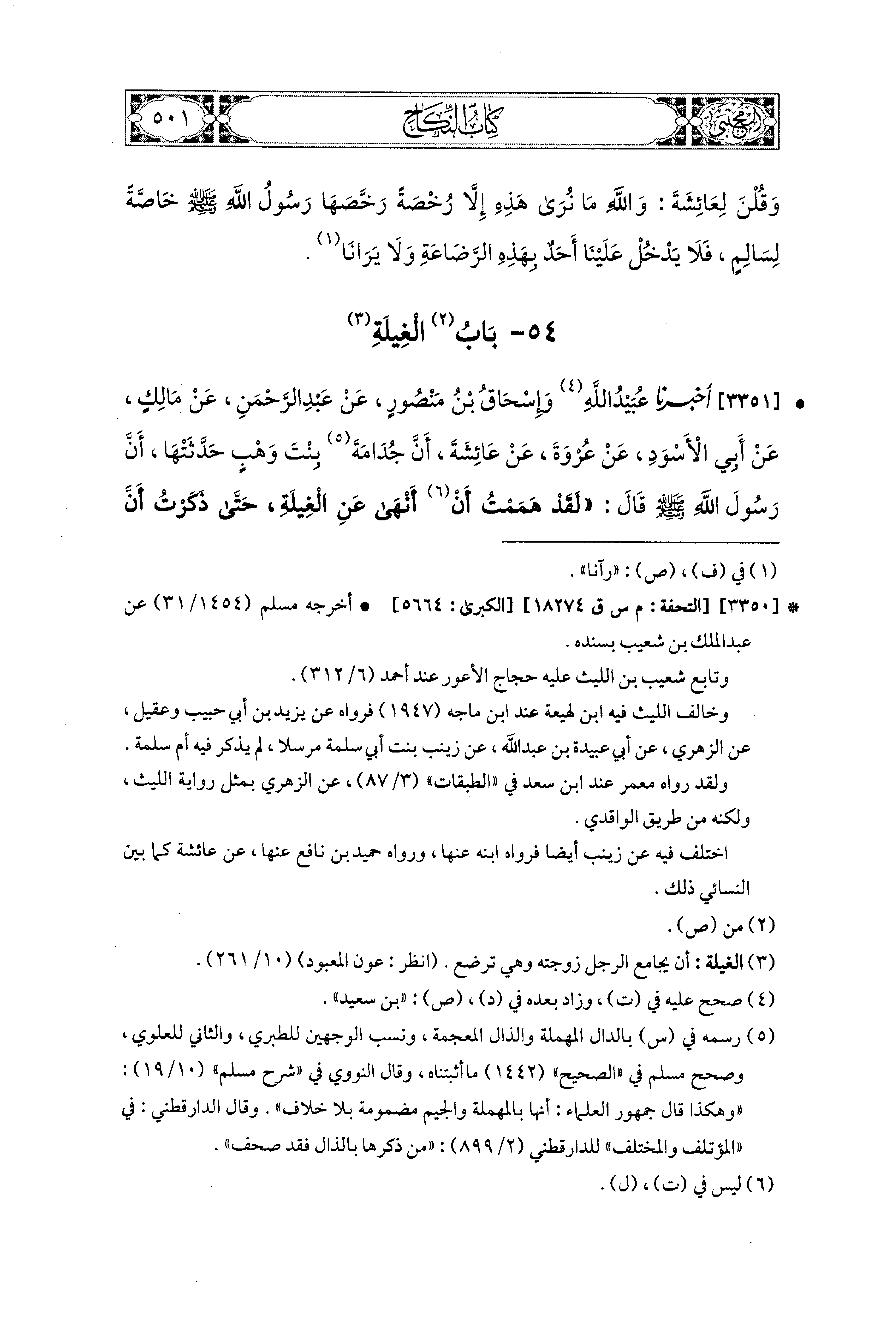 3351 - أَخبَرَنا عُبَيدُ اللهِ، وَإِسحَاقُ بْنُ مَنْصُورٍ، عَن عَبدِ الرَّحمَنِ، عَن مَالِكٍ، عَن أَبي الأَسْوَدِ، عَن عُرْوَةَ، عَن عَائِشَةَ، أَنَّ جُدَامَةَ بِنْتَ وَهْبٍ، حَدَّثَتْهَا أَنَّ رَسُولَ اللهِ صَلى الله عَليه وسَلم قَالَ: لَقَدْ هَمَمْتُ أَنْ أَنْهَى عَنِ الغِيلَةِ حَتَّى ذَكَرْتُ أَنَّ فَارِسَ وَالرُّومَ تَصْنَعُهُ، وَقَالَ إِسحَاقُ: يَصْنَعُونَهُ، فَلاَ يَضُرُّ أَوْلاَدَهُمْ.