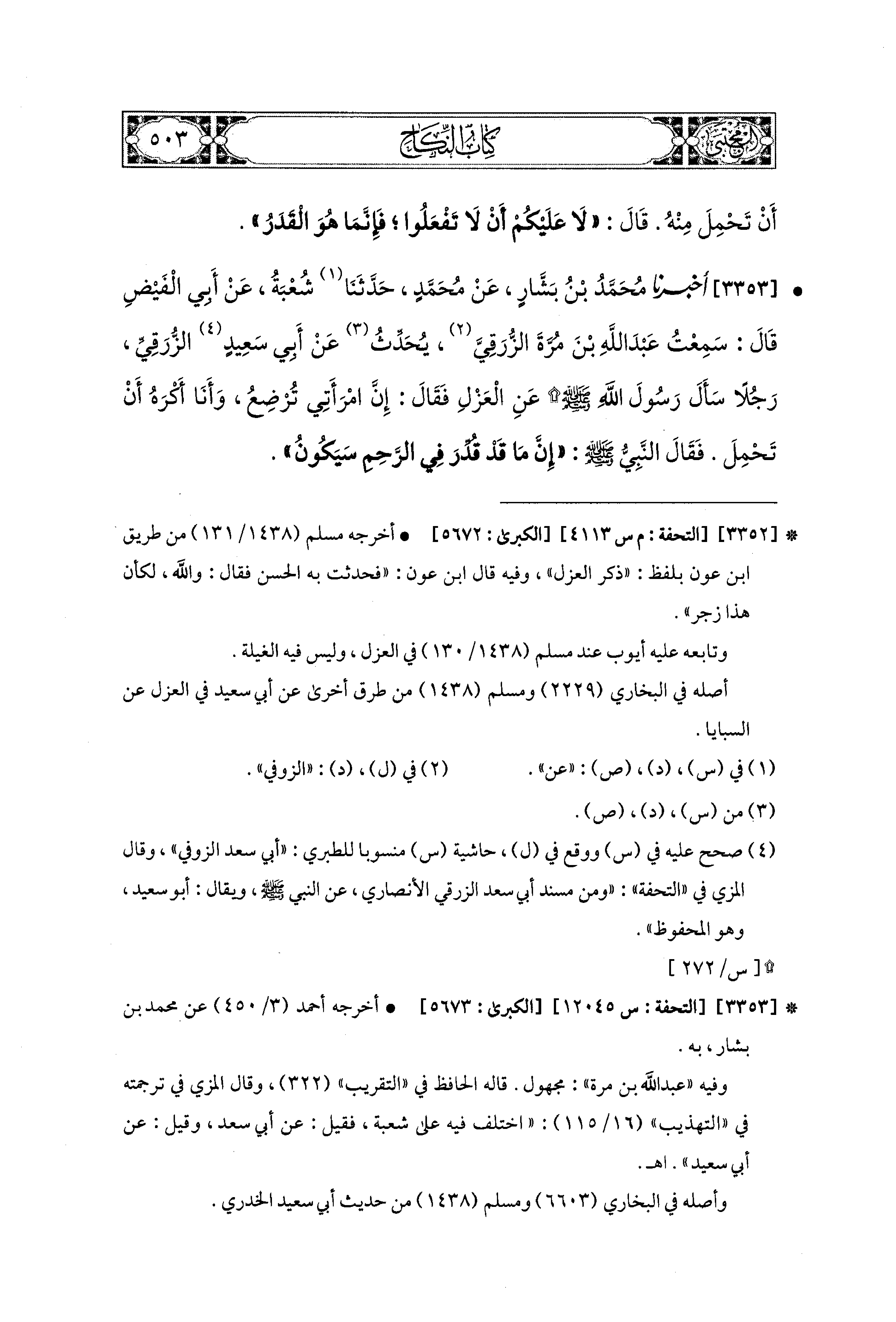 3353 - أَخبَرَنا مُحَمد بْنُ بَشَّارٍ، عَن مُحَمدٍ، حَدثنا شُعبَةُ، عَن أَبي الفَيْضِ، قَالَ: سَمِعْتُ عَبدَ اللهِ بْنَ مُرَّةَ الزُّرَقِيَّ، عَن أَبي سَعيدٍ الزُّرَقِيِّ؛ رَجُلاً سَأَلَ رَسُولَ اللهِ صَلى الله عَليه وسَلم عَنِ العَزْلِ، فَقَالَ: إِنَّ امْرَأَتِي تُرْضِعُ وَأَنَا أَكْرَهُ أَنْ تَحْمِلَ، فَقَالَ النَّبيُّ صَلى الله عَليه وسَلم: إِنَّ مَا قَدْ قُدِّرَ فِي الرَّحِمِ سَيَكُونُ.