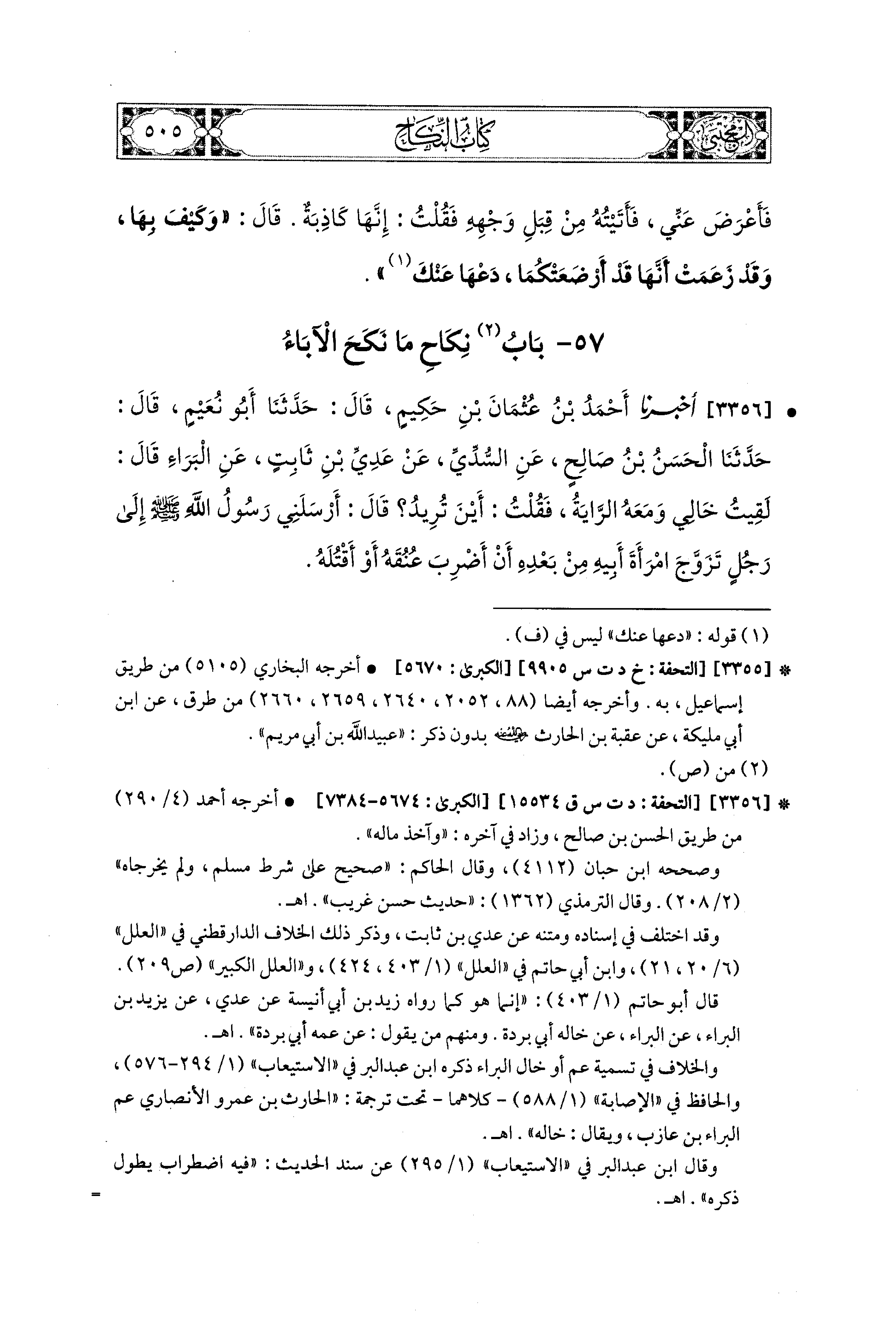 3356 - أَخبَرَنا أَحْمَدُ بْنُ عُثمَانَ بْنِ حَكِيمٍ، قال: حَدثنا أَبو نُعَيْمٍ، قال: حَدثنا الحَسَنُ بْنُ صَالِحٍ، عَنِ السُّدِّيِّ، عَن عَدِيِّ بْنِ ثَابِتٍ، عَنِ البَرَاءِ، قَالَ: لَقِيتُ خَالِي وَمَعَهُ الرَّايَةُ، فَقُلْتُ: أَيْنَ تُرِيدُ؟ قَالَ: أَرْسَلَني رَسُولُ اللهِ صَلى الله عَليه وسَلم إِلَى رَجُلٍ تَزَوَّجَ امْرَأَةَ أَبيهِ مِنْ بَعْدِهِ أَنْ أَضْرِبَ عُنُقَهُ، أَوْ أَقْتُلَهُ.