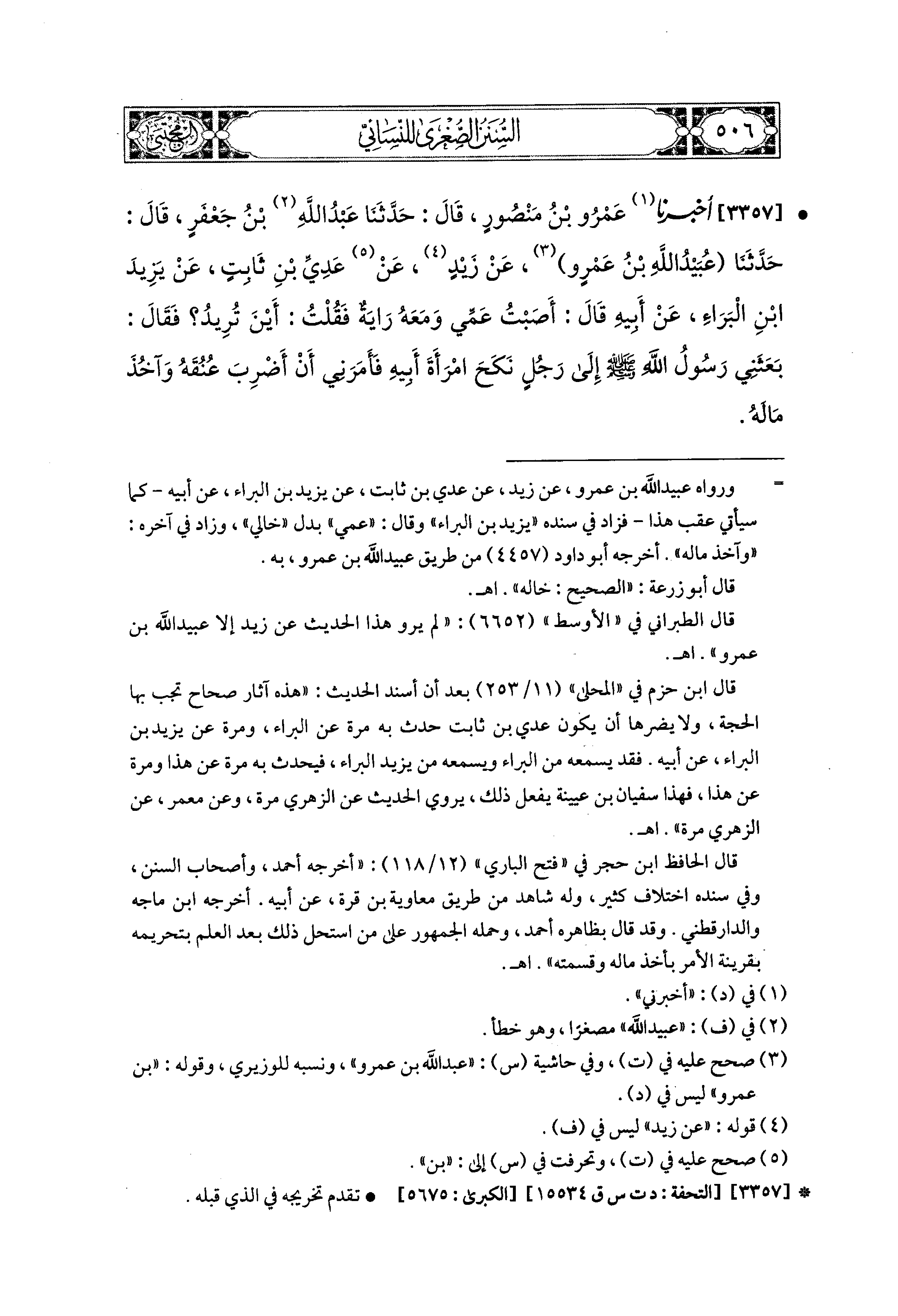 3357 - أَخبَرَنا عَمْرُو بْنُ مَنْصُورٍ، قال: حَدثنا عَبدُ اللهِ بْنُ جَعْفَرٍ، قال: حَدثنا عُبَيدُ اللهِ بْنُ عَمْرٍو، عَن زَيْدٍ، عَن عَدِيِّ بْنِ ثَابِتٍ، عَن يَزِيدَ بْنِ البَرَاءِ، عَن أَبيهِ، قَالَ: أَصَبْتُ عَمِّي وَمَعَهُ رَايَةٌ، فَقُلْتُ: أَيْنَ تُرِيدُ؟ فَقَالَ: بَعَثَني رَسُولُ اللهِ صَلى الله عَليه وسَلم إِلَى رَجُلٍ نَكَحَ امْرَأَةَ أَبيهِ، فَأَمَرَني أَنْ أَضْرِبَ عُنُقَهُ وَآخُذَ مَالَهُ.