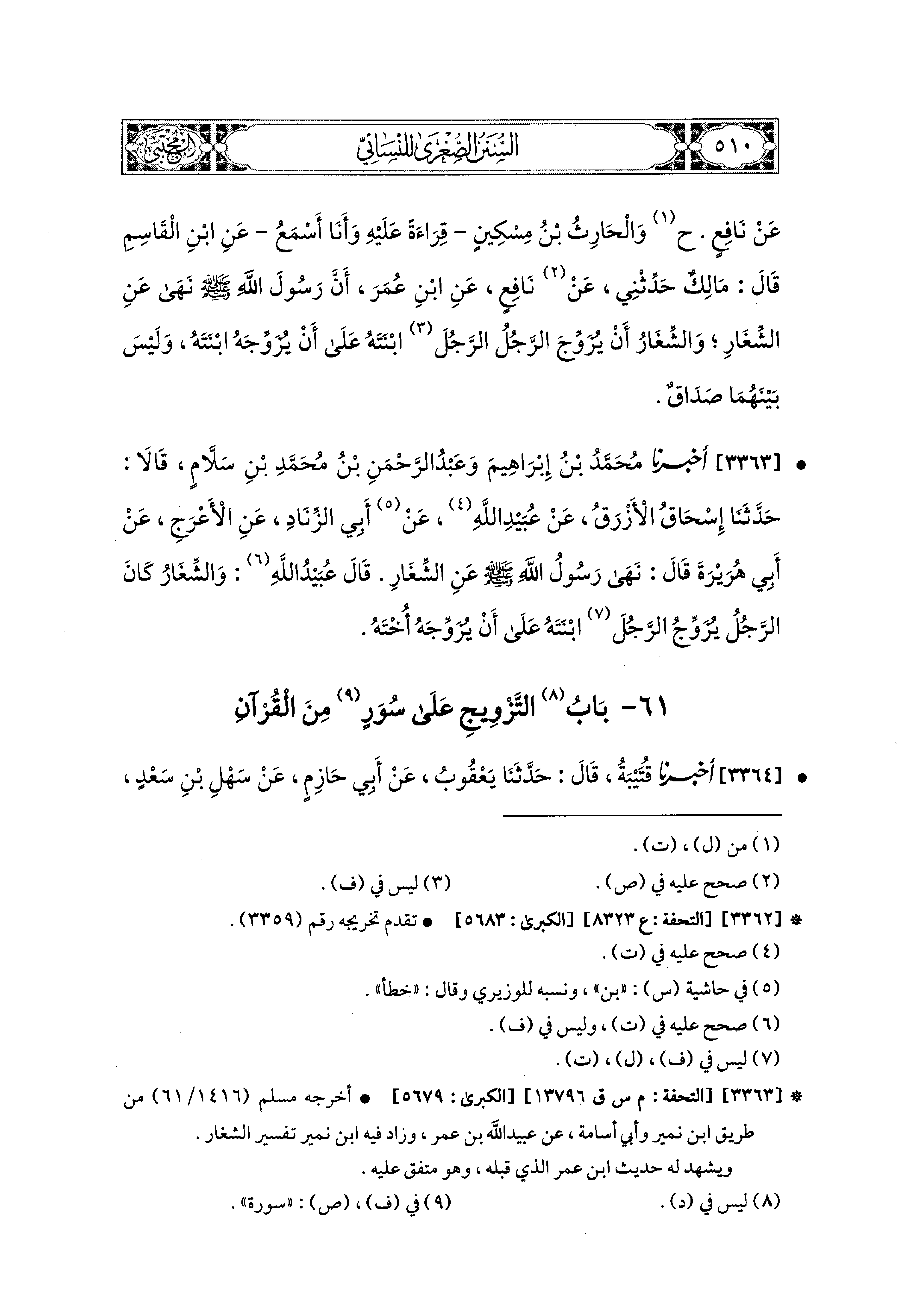 3363 - أَخبَرَنا مُحَمد بْنُ إِبراهِيمَ، وَعَبدُ الرَّحمَنِ بْنُ مُحَمدِ بْنِ سَلاَّمٍ، قَالاَ: حَدَّثَنَا إِسحَاقُ الأَزْرَقُ، عَن عُبَيدِ اللهِ، عَن أَبي الزِّنَادِ، عَنِ الأَعْرَجِ، عَن أَبي هُرَيرَةَ، قَالَ: نَهَى رَسُولُ اللهِ صَلى الله عَليه وسَلم، عَنِ الشِّغَارِ، قَالَ عُبَيدُ اللهِ: وَالشِّغَارُ: كَانَ الرَّجُلُ يُزَوِّجُ الرَّجُلُ ابنَتَهُ عَلَى أَنْ يُزَوِّجَهُ أُخْتَهُ.