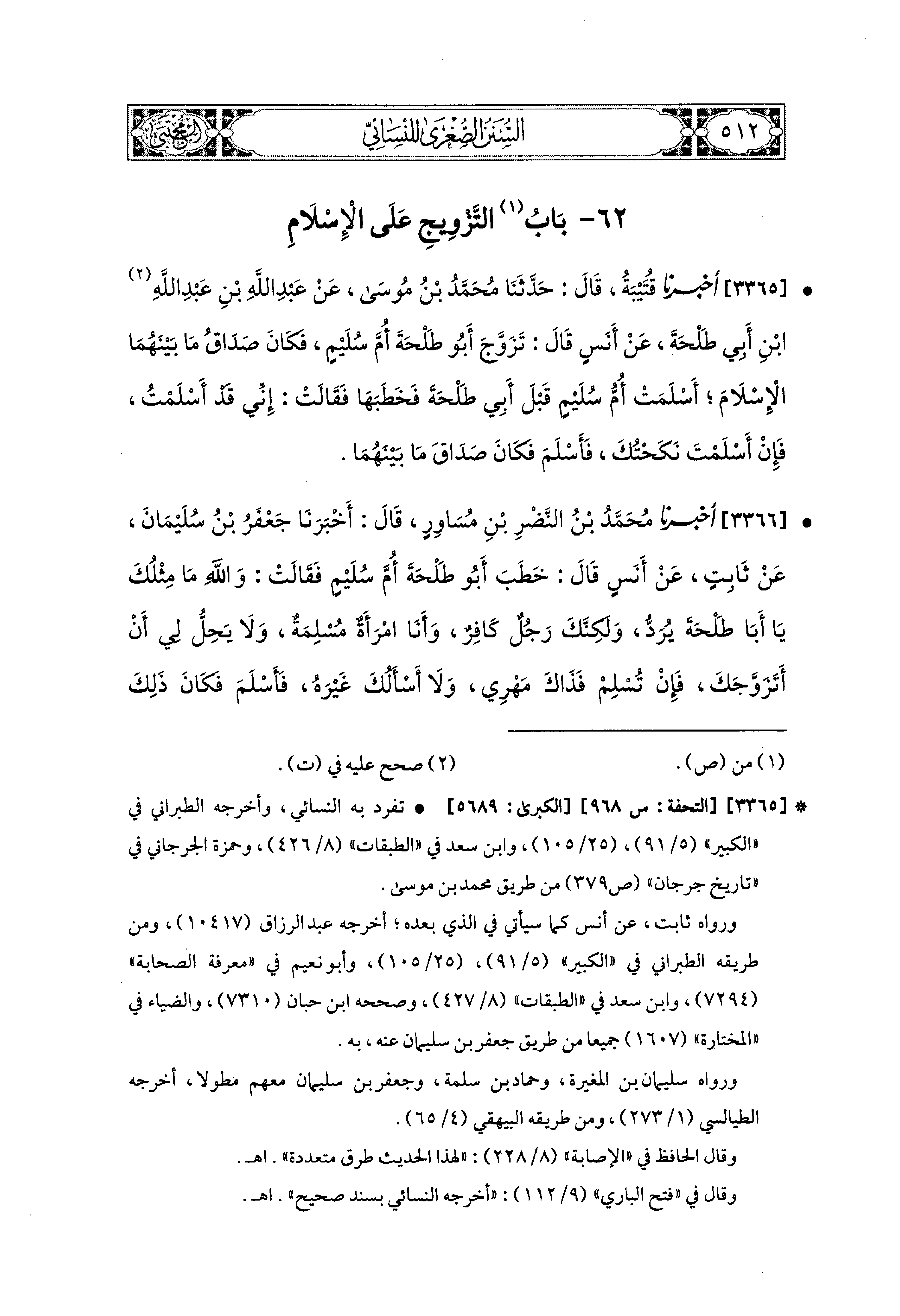 3365 - أَخبَرَنا قُتَيبَةُ، قال: حَدثنا مُحَمدُ بْنُ مُوسَى، عَن عَبد اللهِ بن عَبدِ اللهِ بْنِ أَبي طَلْحَةَ، عَن أَنَسٍ، قَالَ: تَزَوَّجَ أَبو طَلْحَةَ أُمَّ سُلَيْمٍ، فَكَانَ صِدَاقُ مَا بَيْنَهُمَا الإِسْلاَمَ، أَسْلَمَتْ أُمُّ سُلَيْمٍ قَبْلَ أَبي طَلْحَةَ، فَخَطَبَهَا، فَقَالَتْ: إِنِّي قَدْ أَسْلَمْتُ، فَإِنْ أَسْلَمْتَ نَكَحْتُكَ، فَأَسْلَمَ فَكَانَ صِدَاقَ مَا بَيْنَهُمَا.