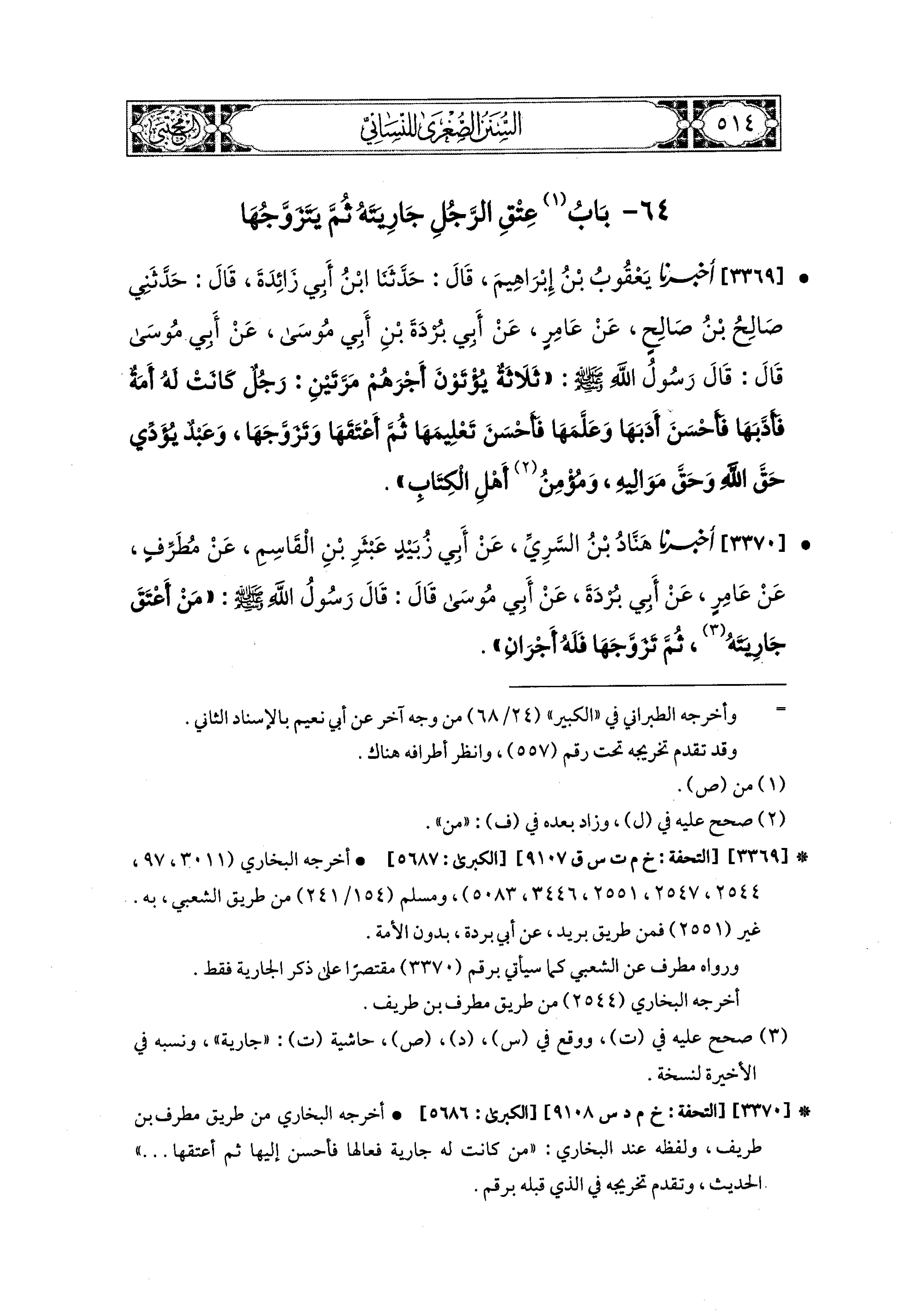 3370 - أَخبَرَنا هَنَّادُ بْنُ السَّرِيِّ، عَن أَبي زُبَيْدٍ عَبْثَرُ بْنُ القَاسِمِ، عَن مُطَرِّفٍ، عَن عَامِرٍ، عَن أَبي بُرْدَةَ، عَن أَبي مُوسَى، قَالَ: قَالَ رَسُولُ اللهِ صَلى الله عَليه وسَلم: مَنْ أَعْتَقَ جَارِيَتَهُ، ثُمَّ تَزَوَّجَهَا فَلَهُ أَجْرَانِ.