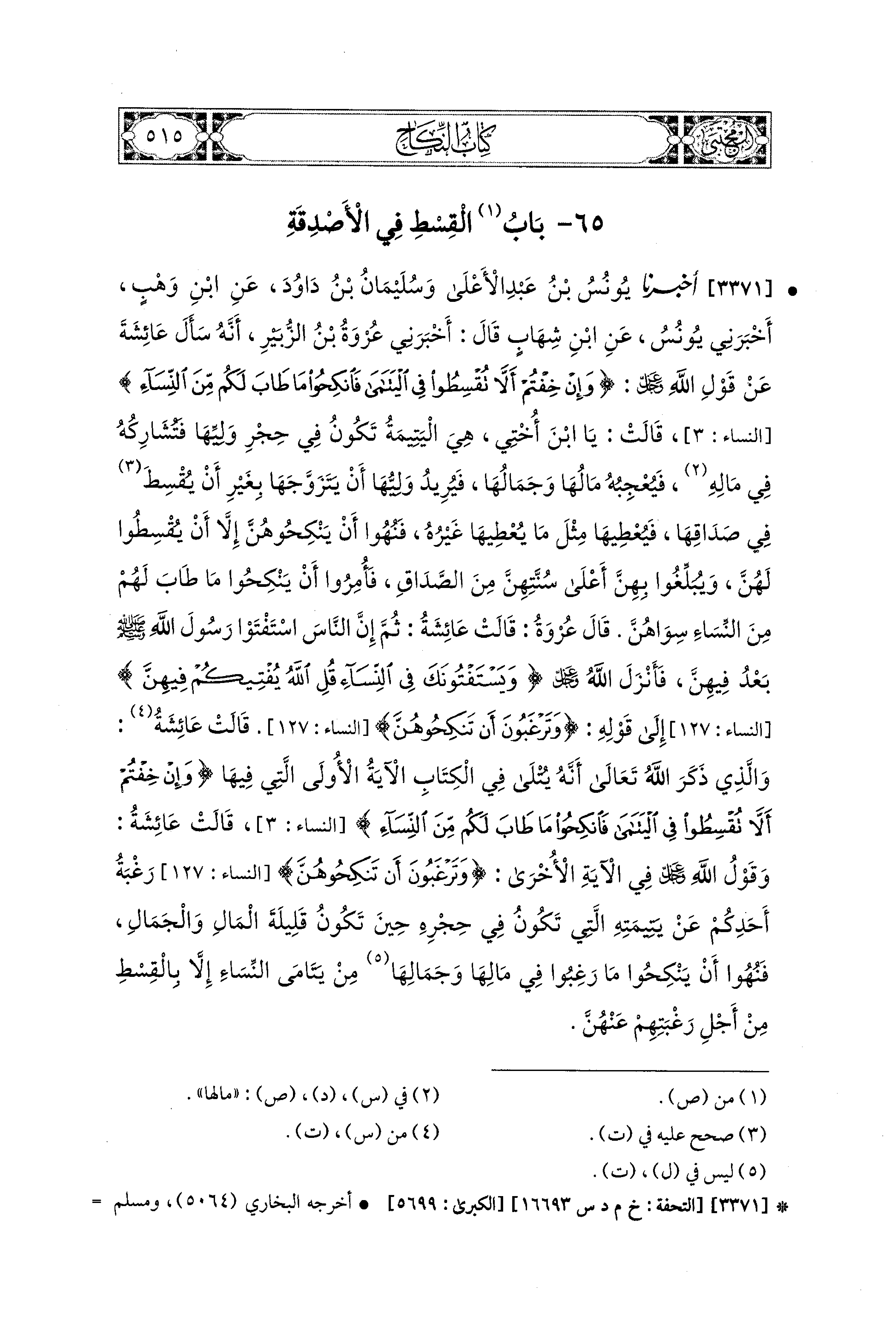 3371 - أَخبَرَنا يُونُسُ بن عَبدِ الأَعلَى، وَسُلَيمَانُ بْنُ دَاوُدَ، عَنِ ابنِ وَهْبٍ، أَخبَرني يُونُسُ، عَنِ ابنِ شِهَابٍ، قَالَ: أَخبَرني عُرْوَةُ بْنُ الزُّبَيْرِ، أَنَّهُ سَأَلَ عَائِشَةَ عَن قَوْلِ اللهِ عَزَّ وَجَلَّ: {وَإِنْ خِفْتُمْ أَلاَّ تُقْسِطُوا فِي اليَتَامَى فَانْكِحُوا مَا طَابَ لَكُمْ مِنَ النِّسَاءِ} قَالَتْ: يَا ابنَ أُخْتِي، هِيَ اليَتِيمَةُ، تَكُونُ فِي حَجْرِ وَلِيِّهَا، فَتُشَارِكُهُ فِي مَالِهِ، فَيُعْجِبُهُ مَالُهَا وَجَمَالُهَا، فَيُرِيدُ وَلِيُّهَا أَنْ يَتَزَوَّجَهَا بِغَيْرِ أَنْ يُقْسِطَ فِي صَدَاقِهَا، فَيُعْطِيَهَا مِثْلَ مَا يُعْطِيهَا غَيْرُهُ، فَنُهُوا أَنْ يَنْكِحُوهُنَّ إِلاَّ أَنْ يُقْسِطُوا لَهُنَّ، وَيَبْلُغُوا بِهِنَّ أَعْلَى سُنَّتِهِنَّ مِنَ الصَّدَاقِ، فَأُمِرُوا أَنْ يَنْكِحُوا مَا طَابَ لَهُمْ مِنَ النِّسَاءِ سِوَاهُنَّ، قَالَ عُرْوَةُ: قَالَتْ عَائِشَةُ: ثُمَّ إِنَّ النَّاسَ اسْتَفْتَوْا رَسُولَ اللهِ صَلى الله عَليه وسَلم بَعْدُ فِيهِنَّ، فَأَنْزَلَ اللهُ عَزَّ وَجَلَّ: {وَيَسْتَفْتُونَكَ فِي النِّسَاءِ قُلِ اللهُ يُفْتِيكُمْ فِيهِنَّ}، إِلَى قَوْلِهِ، {وَتَرْغَبُونَ أَنْ تَنْكِحُوهُنَّ}، قَالَتْ عَائِشَةُ: وَالَّذِي ذَكَرَ اللهُ تَعَالَى أَنَّهُ يُتْلَى فِي الكِتَابِ الآيَةُ الأُولَى الَّتِي فِيهَا {وَإِنْ خِفْتُمْ أَلاَّ تُقْسِطُوا فِي اليَتَامَى فَانْكِحُوا مَا طَابَ لَكُمْ مِنَ النِّسَاءِ}، قَالَتْ عَائِشَةُ: وَقَوْلُ اللهِ عَزَّ وَجَلَّ فِي الآيَةِ الأُخْرَى: {وَتَرْغَبُونَ أَنْ تَنْكِحُوهُنَّ} رَغْبَةَ أَحَدِكُمْ عَن يَتِيمَتِهِ الَّتِي تَكُونُ فِي حَجْرِهِ حِينَ تَكُونُ قَلِيلَةَ المَالِ وَالجَمَالِ، فَنُهُوا أَنْ يَنْكِحُوا مَا رَغِبُوا فِي مَالِهَا وجمالها مِنْ يَتَامَى النِّسَاءِ إِلاَّ بِالقِسْطِ مِنْ أَجْلِ رَغْبَتِهِمْ عَنهُنَّ.