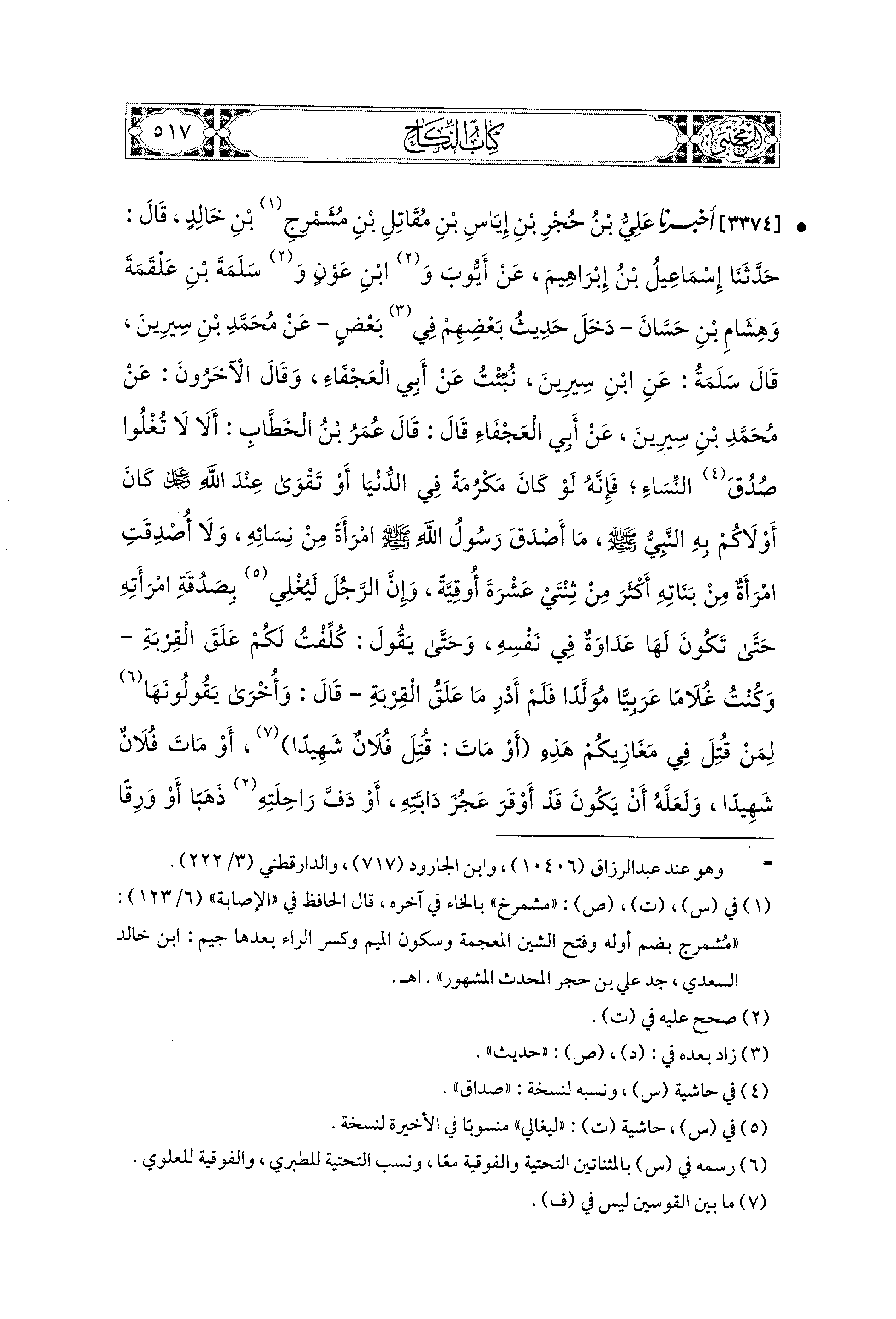 3374 - أَخبَرَنا عَلِيُّ بْنُ حُجْرِ بْنِ إِيَاسِ بْنِ مُقَاتِلِ بْنِ مُشَمْرِجِ (1) بْنِ خَالِدٍ، قال: حَدثنا إِسماعِيلُ بْنُ إِبراهِيمَ، عَن أَيُّوبَ، وَابنِ عَوْنٍ، وَسَلَمَةَ بْنِ عَلْقَمَةَ، وَهِشَامِ بْنِ حَسَّانَ، دَخَلَ حَدِيثُ بَعْضِهِمْ فِي بَعْضٍ، عَن مُحَمدِ بْنِ سِيرِينَ، قَالَ سَلَمَةُ: عَنِ ابنِ سِيرِينَ، نُبِّئْتُ عَن أَبي العَجْفَاءِ، وَقَالَ الآخَرُونَ، عَن مُحَمدِ بْنِ سِيرِينَ، عَن أَبي العَجْفَاءِ، قَالَ: قَالَ عُمَرُ بْنُ الخَطَّابِ: أَلاَ لاَ تَغْلُوا صُدُقَ النِّسَاءِ، فَإِنَّهُ لَوْ كَانَ مَكْرُمَةً فِي الدُّنْيَا (2)، أَوْتَقْوَى عِنْدَ اللهِ عَزَّ وَجَلَّ، كَانَ أَوْلاَكُمْ بِهِ النَّبيُّ صَلى الله عَليه وسَلم،