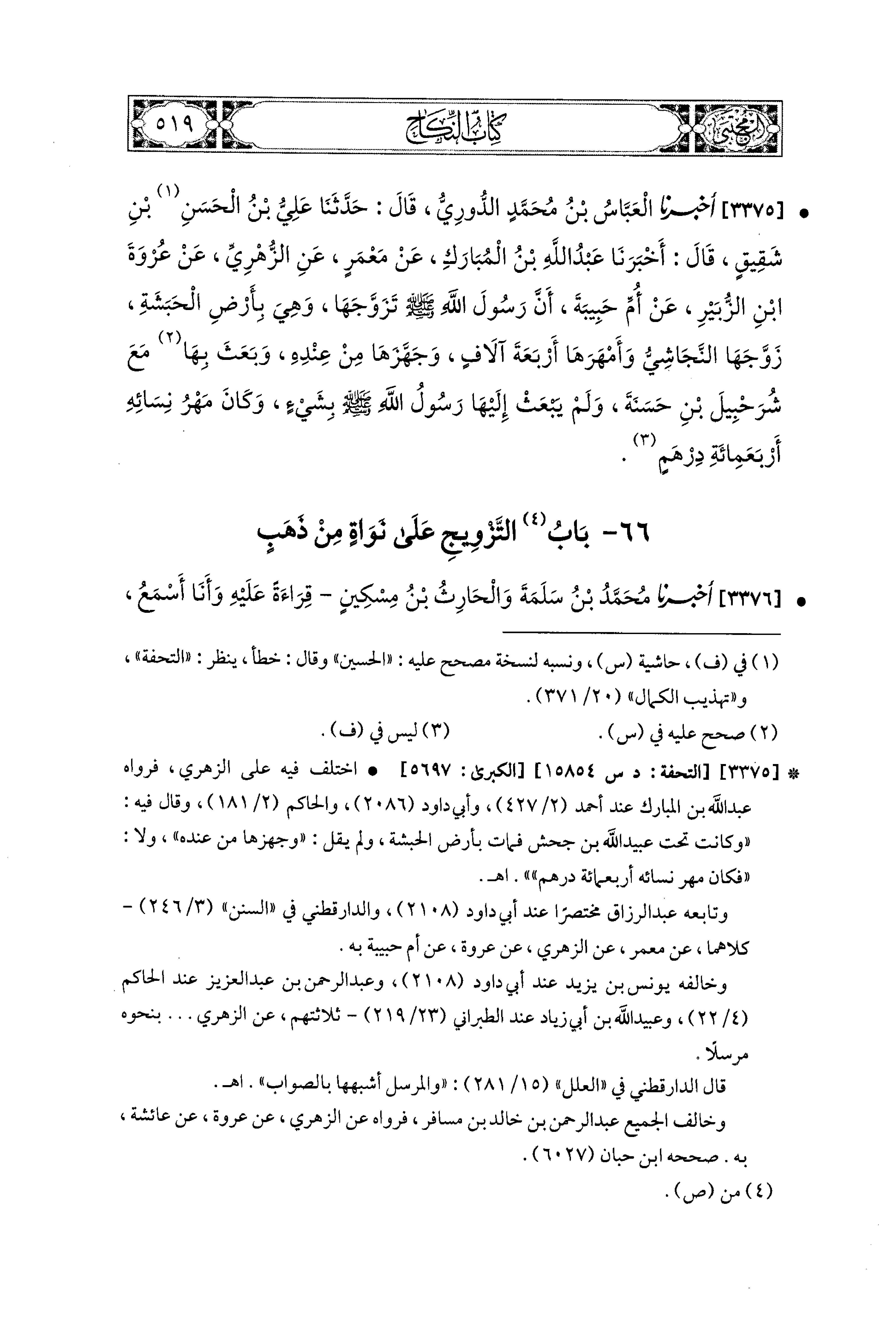3375 - أَخبَرَنا العَبَّاسُ بْنُ مُحَمدٍ الدُّورِيُّ، قال: حَدثنا عَلِيُّ بْنُ الحَسَنِ بْنِ شَقِيقٍ، قَالَ: أَخبَرنا عَبدُ اللهِ بْنُ المُبَارَكِ، عَن مَعْمَرٍ، عَنِ الزُّهْرِيِّ، عَن عُرْوَةَ بْنِ الزُّبَيْرِ، عَن أُمِّ حَبِيبَةَ أَنَّ رَسُولَ اللهِ صَلى الله عَليه وسَلم، تَزَوَّجَهَا وَهِيَ بِأَرْضِ الحَبَشَةِ، زَوَّجَهَا النَّجَاشِيُّ، وَأَمْهَرَهَا أَرْبَعَةَ آلاَفٍ، وَجَهَّزَهَا مِنْ عِنْدِهِ، وَبَعَثَ بِهَا مَعَ شُرَحْبِيلَ ابنِ حَسَنَةَ، وَلَمْ يَبْعَثْ إِلَيْهَا رَسُولُ اللهِ صَلى الله عَليه وسَلم بِشَيْءٍ، وَكَانَ مَهْرُ نِسَائِهِ أَرْبَعَمِئَةِ دِرْهَمٍ.