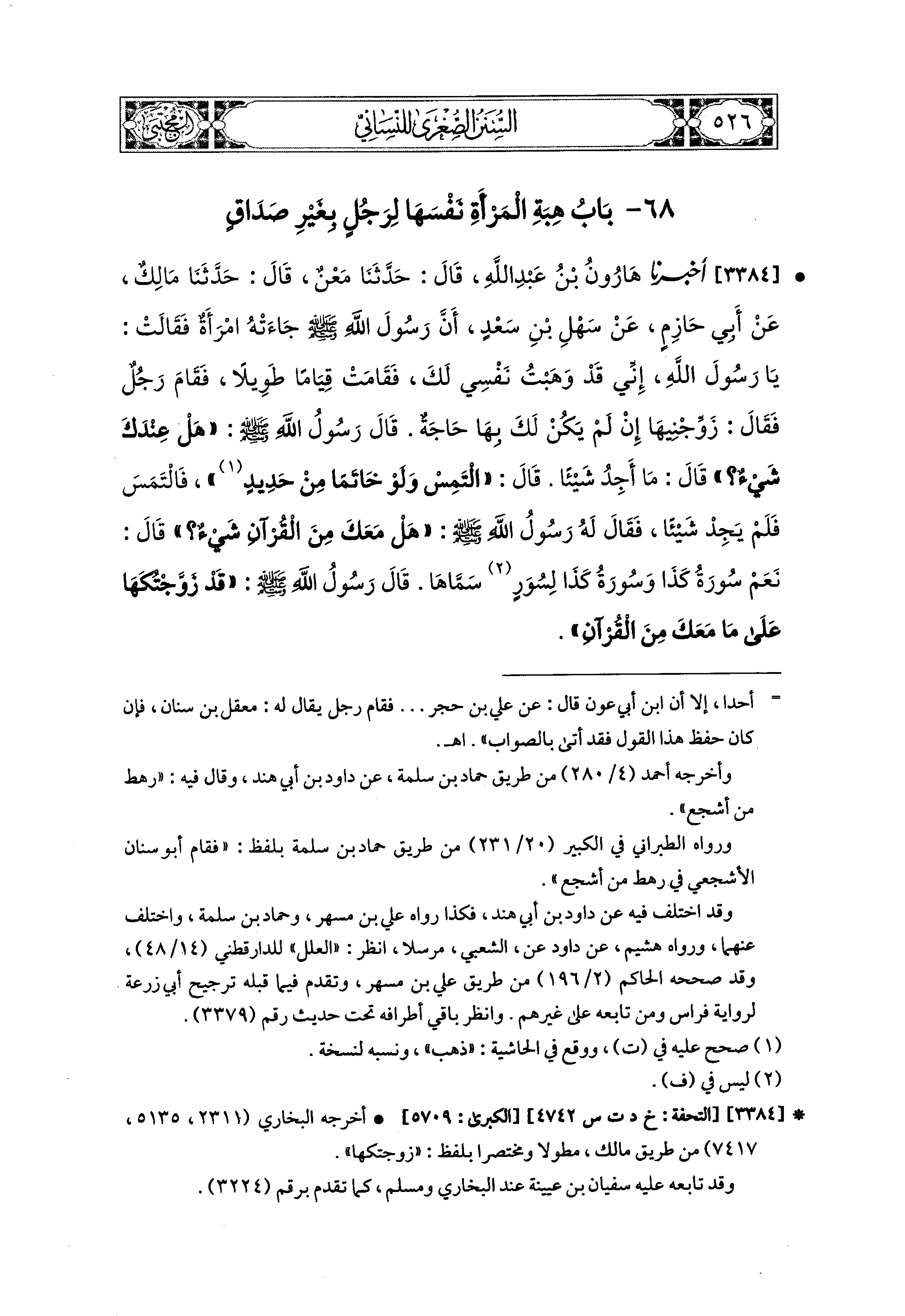 3384 - أَخبَرَنا هَارُونُ بْنُ عَبدِ اللهِ، قال: حَدثنا مَعْنٌ، قال: حَدثنا مَالِكٌ، عَن أَبي حَازِمٍ، عَن سَهْلِ بْنِ سَعْدٍ، أَنَّ رَسُولَ اللهِ صَلى الله عَليه وسَلم جَاءَتْهُ امْرَأَةٌ، فَقَالَتْ: يَا رَسُولَ اللهِ، إِنِّي قَدْ وَهَبْتُ نَفْسِي لَكَ، فَقَامَتْ قِيَامًا طَوِيلاً، فَقَامَ رَجُلٌ، فَقَالَ: زَوِّجْنيهَا إِنْ لَمْ يَكُنْ لَكَ بِهَا حَاجَةٌ، قَالَ رَسُولُ اللهِ صَلى الله عَليه وسَلم: هَلْ عِنْدَكَ شَيْءٌ؟ قَالَ: مَا أَجِدُ شَيْئًا، قَالَ: التَمِسْ وَلَوْ خَاتَمًا مِنْ حَدِيدٍ، فَالتَمَسَ، فَلَمْ يَجِدْ شَيْئًا، فَقَالَ لَهُ رَسُولُ اللهِ صَلى الله عَليه وسَلم: هَلْ مَعَكَ مِنَ القُرْآنِ شَيْءٌ؟ قَالَ: نَعَمْ، سُورَةُ كَذَا وَسُورَةُ كَذَا، لِسُوَرٍ سَمَّاهَا، قَالَ رَسُولُ اللهِ صَلى الله عَليه وسَلم: قَدْ زَوَّجْتُكَهَا عَلَى مَا مَعَكَ مِنَ القُرْآنِ.