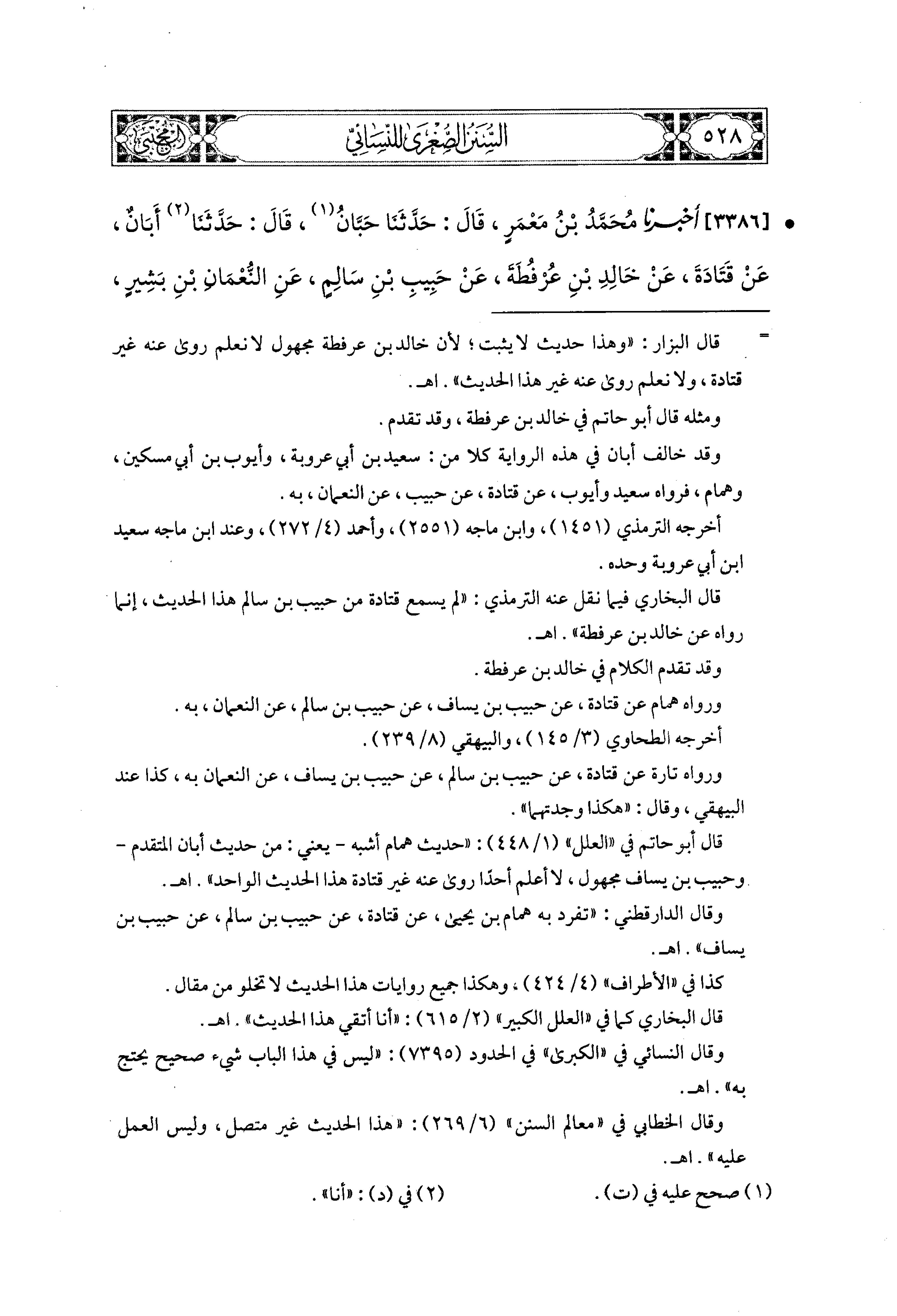 3386 - أَخبَرَنا مُحَمد بْنُ مَعْمَرٍ، قال: حَدثنا حَبَّانُ، قال: حَدثنا أَبَانُ، عَن قَتَادَةَ، عَن خَالِدِ بْنِ عُرْفُطَةَ، عَن حَبِيبِ بْنِ سَالِمٍ، عَنِ النُّعْمَانِ بْنِ بَشِيرٍ؛ أَنَّ رَجُلاً يُقَالُ لَهُ عَبدُ الرَّحمَنِ بْنُ حُنَيْنٍ وَيُنْبَزُ قُرْقُورًا، أَنَّهُ وَقَعَ بِجَارِيَةِ امْرَأَتِهِ، فَرُفِعَ إِلَى النُّعْمَانِ بْنِ بَشِيرٍ، فَقَالَ: لأَقْضِيَنَّ فِيهَا بِقَضِيَّةِ رَسُولِ اللهِ صَلى الله عَليه وسَلم، إِنْ كَانَتْ أَحَلَّتْهَا لَكَ جَلَدْتُكَ، وَإِنْ لَمْ تَكُنْ أَحَلَّتْهَا لَكَ رَجَمْتُكَ بِالحِجَارَةِ، فَكَانَتْ أَحَلَّتْهَا لَهُ، فَجُلِدَ مِئَةً، قَالَ قَتَادَةُ: فَكَتَبْتُ إِلَى حَبِيبِ بْنِ سَالِمٍ، فَكَتَبَ إِلَيَّ بِهَذَا.