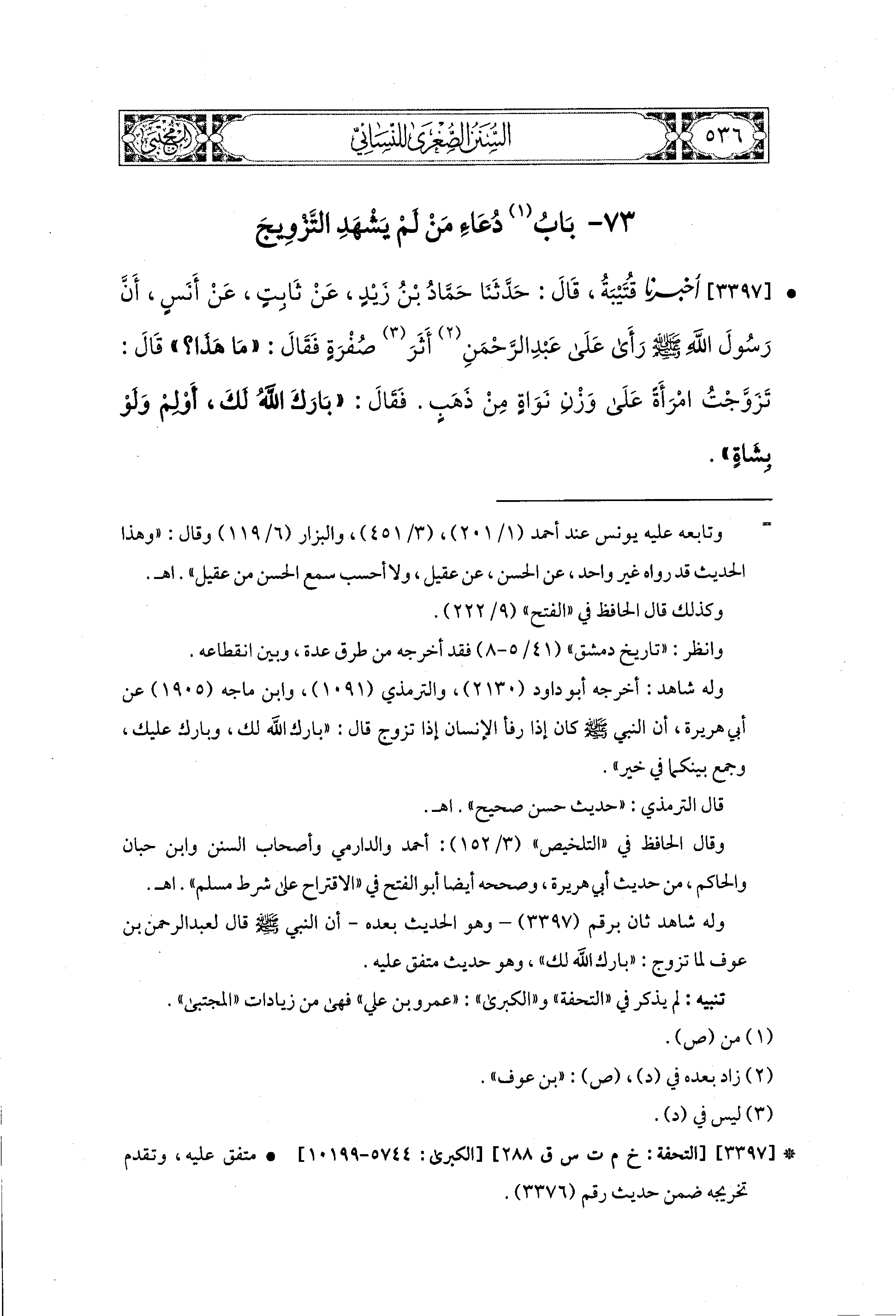 3397 - أَخبَرَنا قُتَيبَةُ، قال: حَدثنا حَمَّادُ بْنُ زَيْدٍ، عَن ثَابِتٍ، عَن أَنَسٍ، أَنَّ رَسُولَ اللهِ صَلى الله عَليه وسَلم رَأَى عَلَى عَبدِ الرَّحمَنِ أَثَرَ صُفْرَةٍ، فَقَالَ: مَا هَذَا؟ قَالَ: تَزَوَّجْتُ امْرَأَةً عَلَى وَزْنِ نَوَاةٍ مِنْ ذَهَبٍ، فَقَالَ: بَارَكَ اللهُ لَكَ، أَوْلِمْ وَلَوْ بِشَاةٍ.