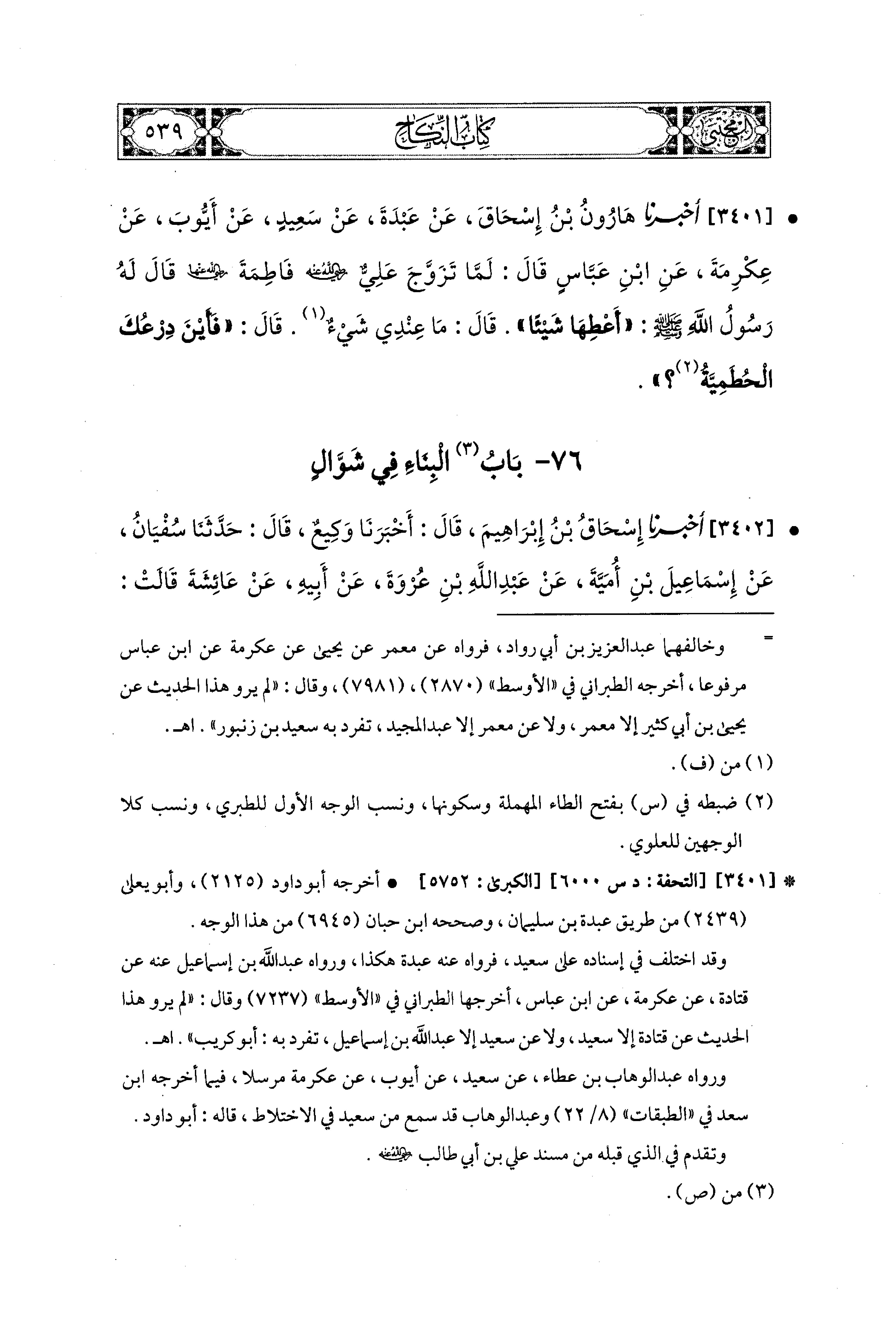 3401 - أَخبَرَنا هَارُونُ بْنُ إِسحَاقَ، عَن عَبدَةَ، عَن سَعيدٍ، عَن أَيُّوبَ، عَن عِكْرِمَةَ، عَنِ ابنِ عَبَّاسٍ، قَالَ: لَمَّا تَزَوَّجَ عَلِيٌّ رَضِيَ اللهُ عَنهُ فَاطِمَةَ رَضِيَ اللهُ عَنهَا، قَالَ لَهُ رَسُولُ اللهِ صَلى الله عَليه وسَلم: أَعْطِهَا شَيْئًا، قَالَ: مَا عِنْدِي شئ، قَالَ: فَأَيْنَ دِرْعُكَ الحُطَميَّةُ؟.