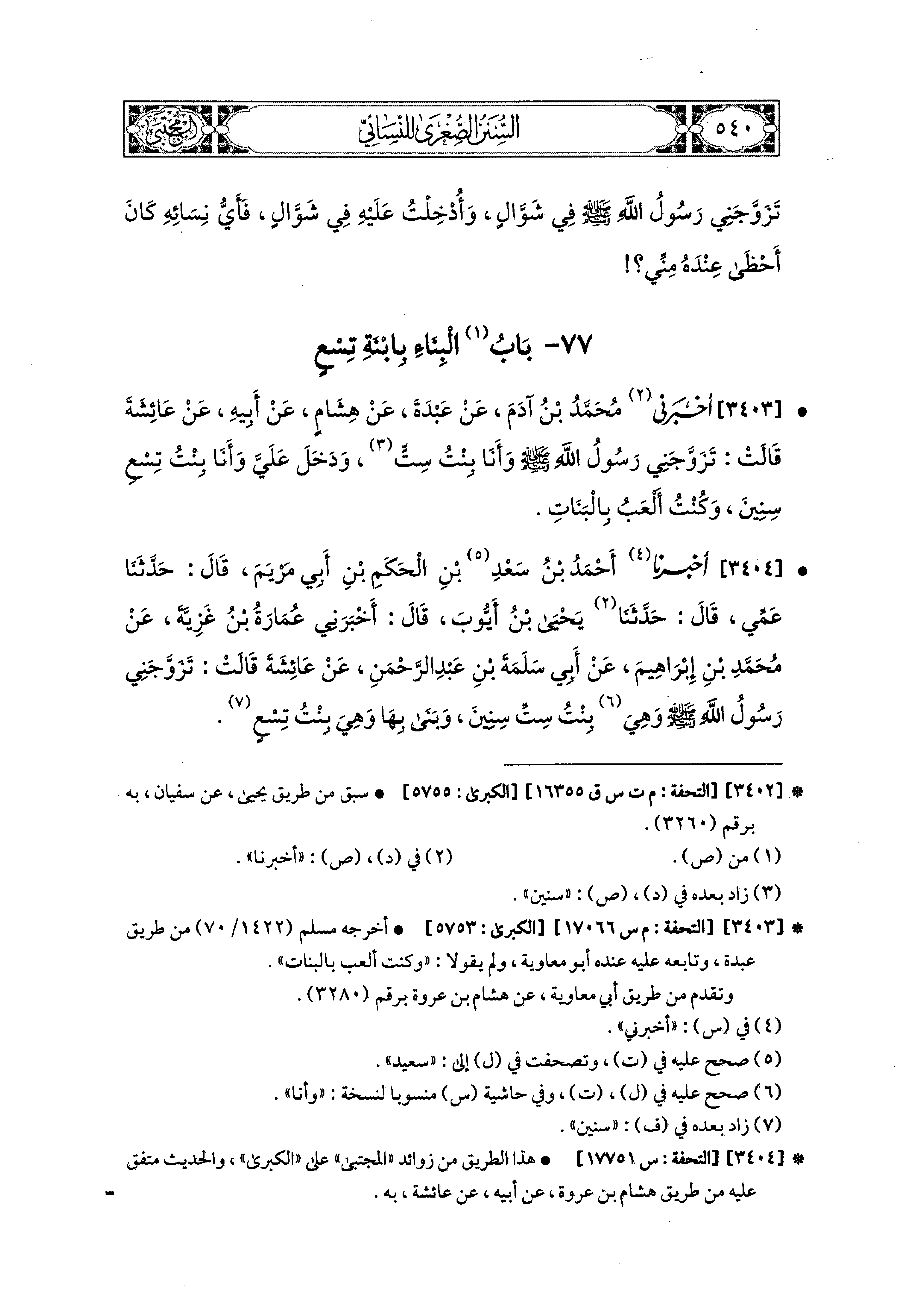 3404 - أَخبَرَنا أَحْمَدُ بْنُ سَعْدِ بْنِ الحَكَمِ بْنِ أَبي مَرْيَمَ، قال: حَدثنا عَمِّي، قال: حَدثنا يَحيَى بْنُ أَيُّوبَ، قَالَ: أَخبَرني عُمَارَةُ بْنُ غَزِيَّةَ، عَن مُحَمدِ بْنِ إِبراهِيمَ، عَن أَبي سَلَمَةَ بْنِ عَبدِ الرَّحمَنِ، عَن عَائِشَةَ، قَالَتْ: تَزَوَّجَني رَسُولُ اللهِ صَلى الله عَليه وسَلم وَهِيَ بِنْتُ سِتِّ سِنينَ، وَبَنَى بِهَا وَهِيَ بِنْتُ تِسْعٍ.