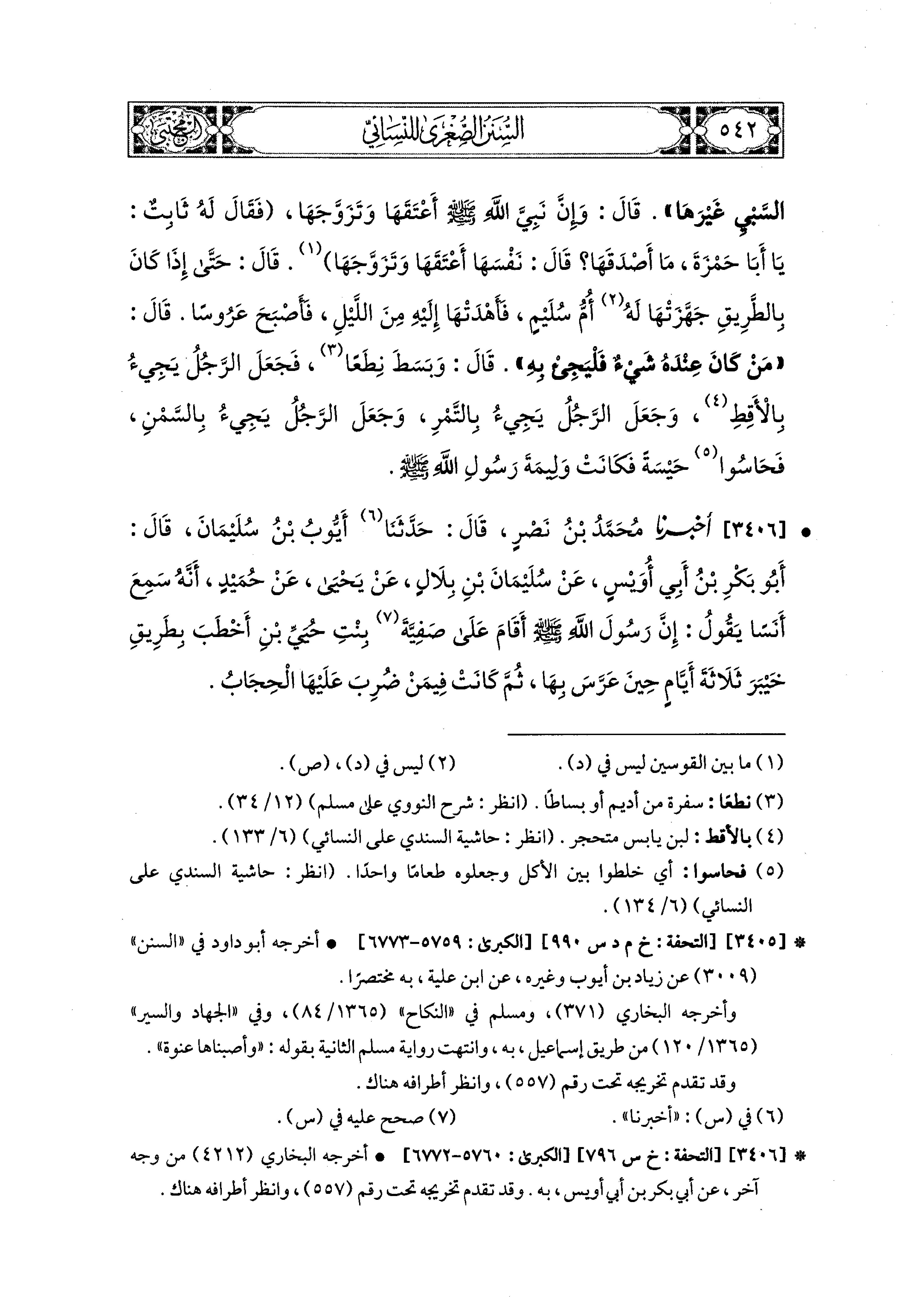 3406 - أَخبَرَنا مُحَمد بْنُ نَصْرٍ، قال: حَدثنا أَيُّوبُ بْنُ سُلَيمَانَ، قَالَ: أَبو بَكْرِ بْنُ أَبي أُوَيْسٍ، عَن سُلَيمَانَ بْنِ بِلاَلٍ، عَن يَحيَى، عَن حُمَيدٍ، أَنَّهُ سَمِعَ أَنَسًا يَقُولُ: إِنَّ رَسُولَ اللهِ صَلى الله عَليه وسَلم أَقَامَ عَلَى صَفِيَّةَ بِنْتِ حُيَيِّ بْنِ أَخْطَبَ بِطَرِيقِ خَيْبَرَ ثَلاَثَةَ أَيَّامٍ حِينَ عَرَّسَ بِهَا، ثُمَّ كَانَتْ فِيمَنْ ضُرِبَ عَلَيهَا الحِجَابُ.