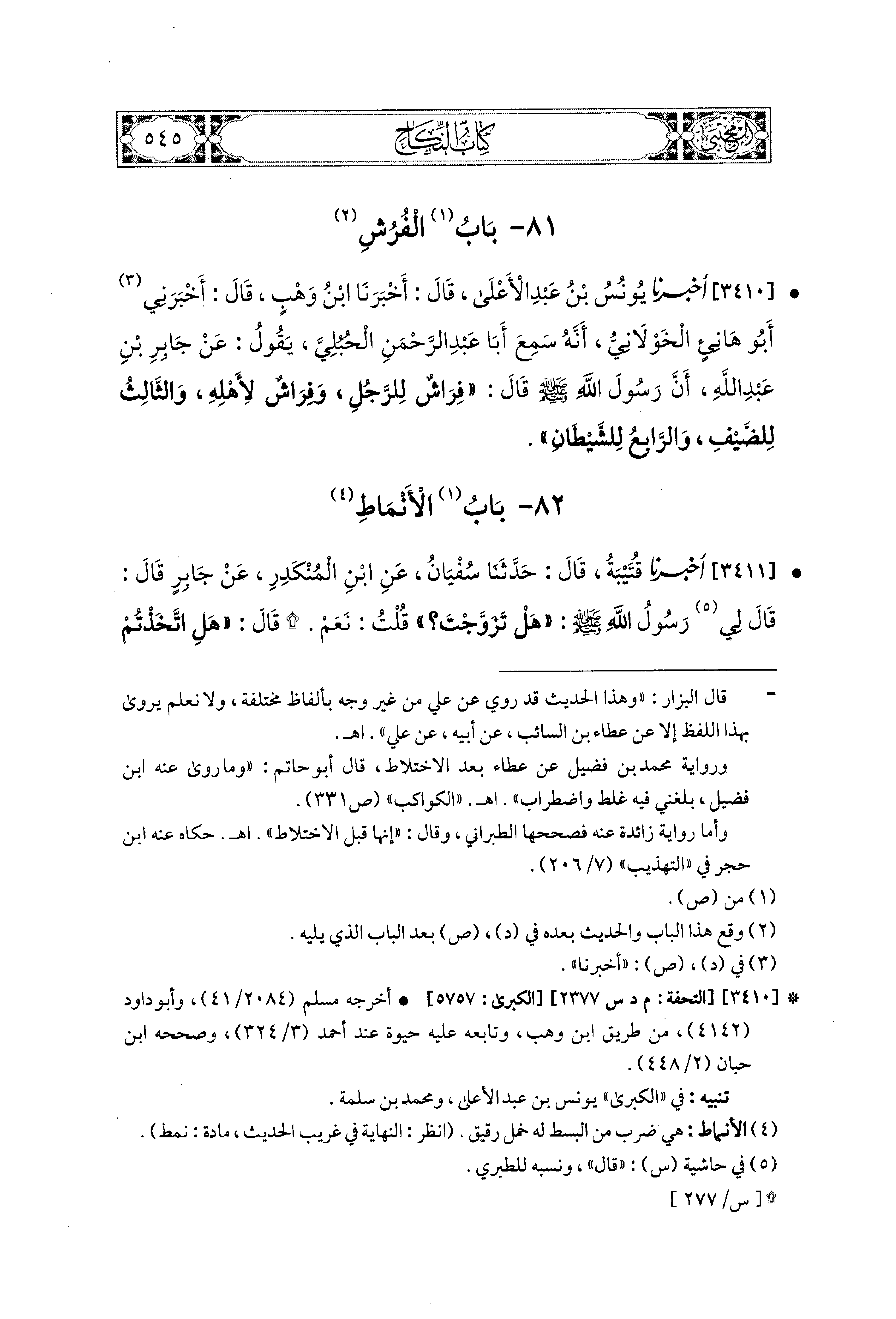 3411 - أَخبَرَنا قُتَيبَةُ، قال: حَدثنا سُفيَانُ، عَنِ ابنِ المُنْكَدِرِ، عَن جَابِرٍ، قَالَ: قَالَ لِي رَسُولُ اللهِ صَلى الله عَليه وسَلم: هَلْ تَزَوَّجْتَ؟ قُلْتُ: نَعَمْ، قَالَ: هَلِ اتَّخَذْتُمْ أَنْمَاطًا؟ قُلْتُ: وَأَنَّى لَنَا أَنْمَاطٌ؟ قَالَ: إِنَّهَا سَتَكُونُ.