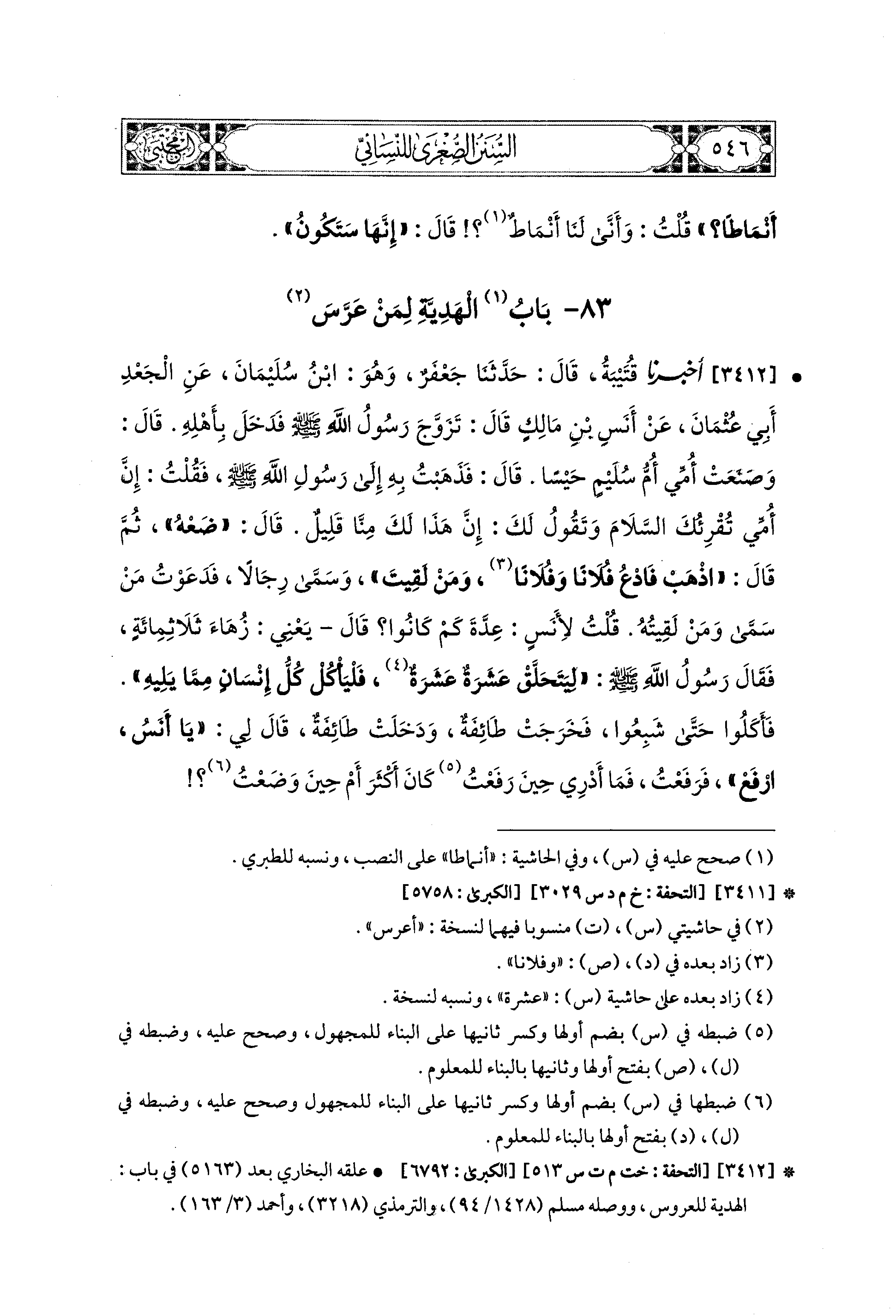 3412 - أَخبَرَنا قُتَيبَةُ، قال: حَدثنا جَعْفَرٌ، وَهُوَ ابنُ سُلَيمَانَ، عَنِ الجَعْدِ أَبي عُثمَانَ، عَن أَنَسِ بْنِ مَالِكٍ، قَالَ: تَزَوَّجَ رَسُولُ اللهِ صَلى الله عَليه وسَلم فَدَخَلَ بِأَهْلِهِ، قَالَ: وَصَنَعَتْ أُمِّي أُمُّ سُلَيْمٍ حَيْسًا، قَالَ: فَذَهَبَتْ بِهِ إِلَى رَسُولِ اللهِ صَلى الله عَليه وسَلم، فَقُلْتُ: إِنَّ أُمِّي تُقْرِئُكَ السَّلاَمَ، وَتَقُولُ لَكَ إِنَّ هَذَا لَكَ مِنَّا قَلِيلٌ، قَالَ: ضَعْهُ، ثُمَّ قَالَ: اذْهَبْ فَادْعُ فُلاَنًا وَفُلاَنًا وَمَنْ لَقِيتَ وَسَمَّى رِجَالاً، فَدَعَوْتُ مَنْ سَمَّى وَمَنْ لَقِيتُهُ، قُلْتُ لأَنَسٍ: عِدَّةُ كَمْ كَانُوا؟ قَالَ: يَعْني زُهَاءَ ثَلاَثَ مِئَةٍ، فَقَالَ رَسُولُ اللهِ صَلى الله عَليه وسَلم: لِيَتَحَلَّقْ عَشَرَةٌ عَشَرَةٌ، فَلْيَأْكُلْ كُلُّ إِنْسَانٍ مِمَّا يَلِيهِ فَأَكَلُوا حَتَّى شَبِعُوا، فَخَرَجَتْ طَائِفَةٌ وَدَخَلَتْ طَائِفَةٌ، قَالَ لِي: يَا أَنَسُ، ارْفَعْ فَرَفَعْتُ، فَمَا أَدْرِي حِينَ رَفَعْتُ كَانَ أَكْثَرَ أَمْ حِينَ وَضَعْتُ.
