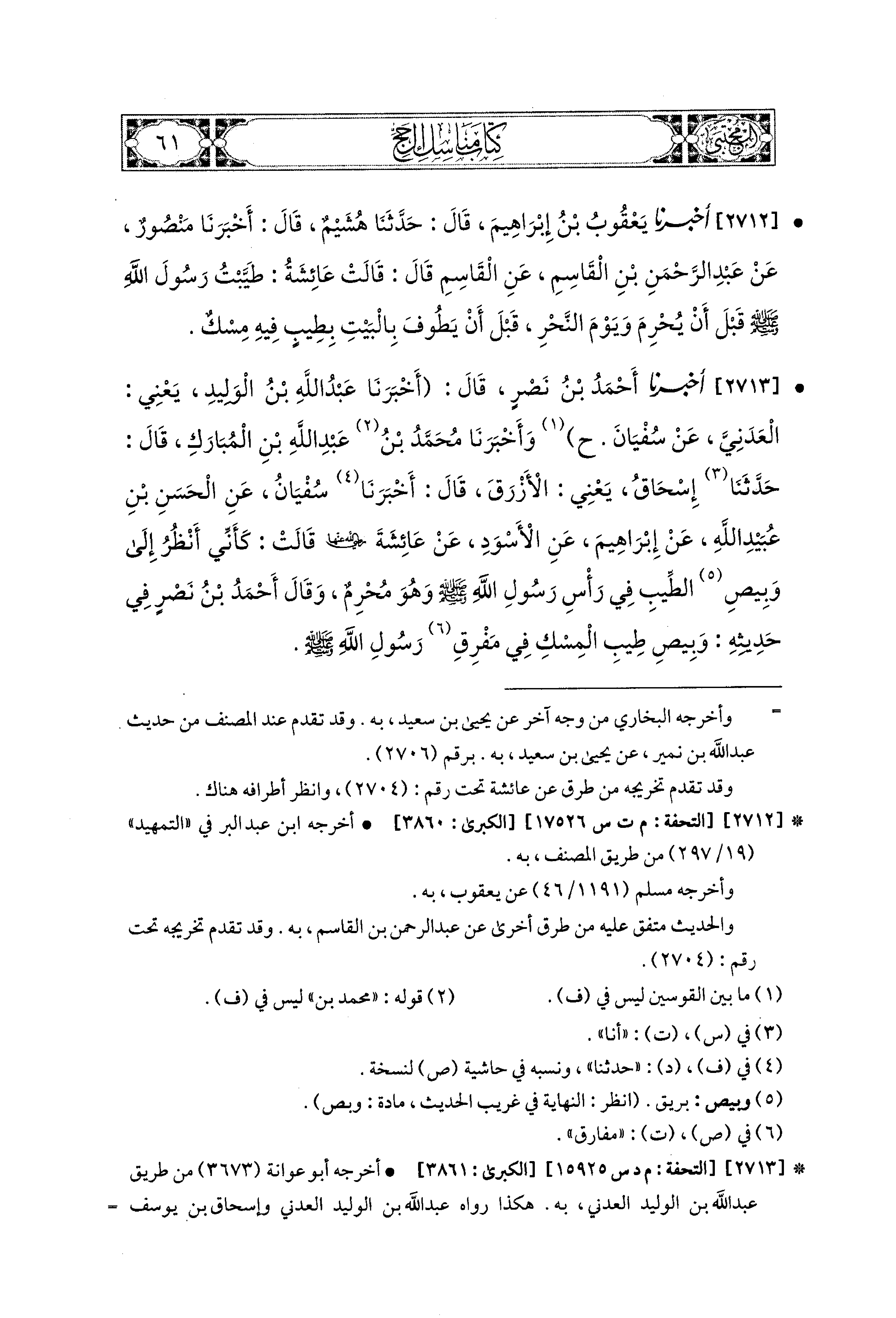 2712 - أَخبَرَنا يَعقُوبُ بْنُ إِبراهِيمَ، قال: حَدثنا هُشَيْمٌ، قَالَ: أَخبَرنا مَنْصُورٌ، عَن عَبدِ الرَّحمَنِ بْنِ القَاسِمِ، عَنِ القَاسِمِ، قَالَ: قَالَتْ عَائِشَةُ: طَيَّبْتُ رَسُولَ اللهِ صَلى الله عَليه وسَلم، قَبْلَ أَنْ يُحْرِمَ، وَيَوْمَ النَّحْرِ، قَبْلَ أَنْ يَطُوفَ بِالبَيْتِ، بِطِيبٍ فِيهِ مِسْكٌ.