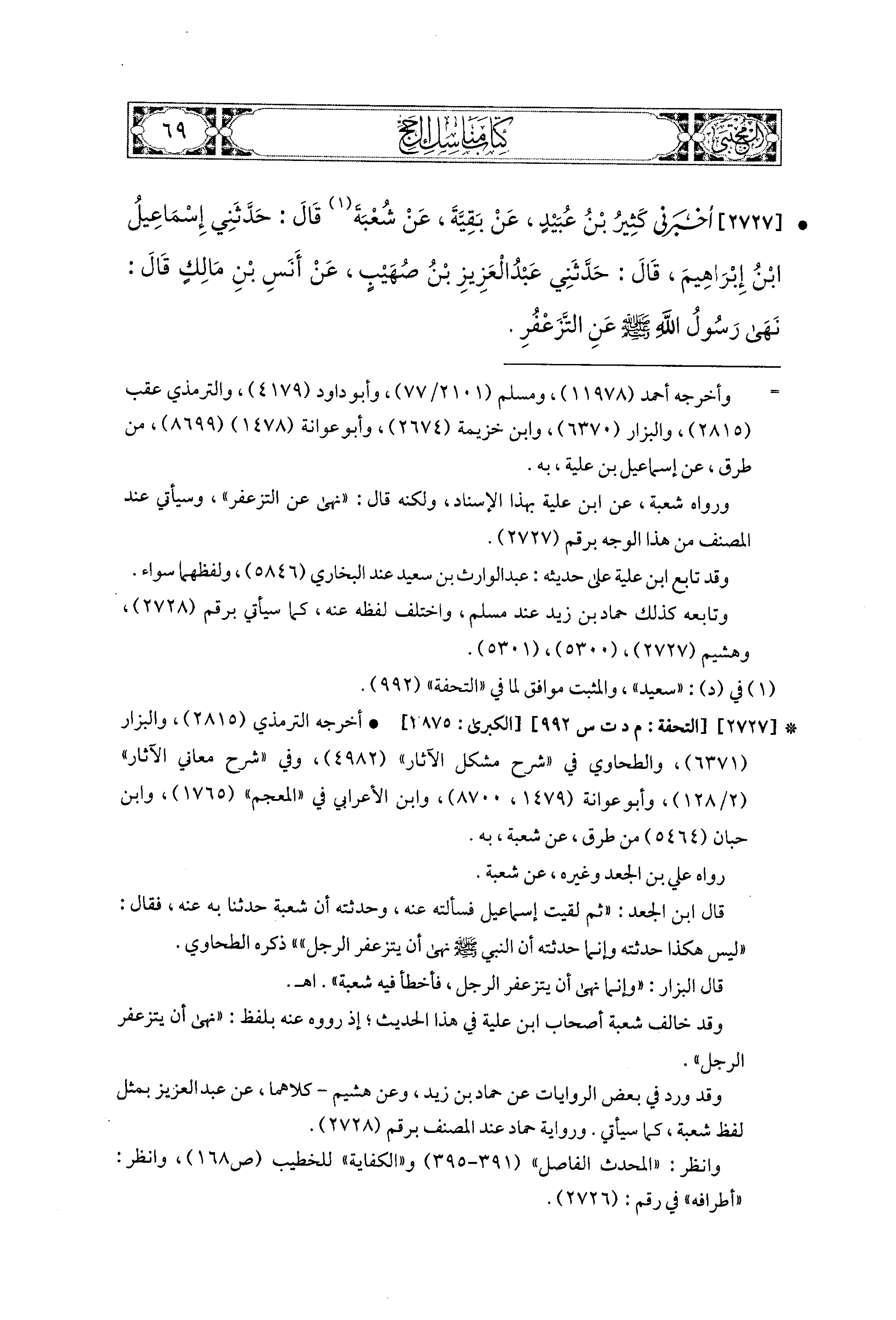 2727 - أَخبَرني كَثِيرُ بْنُ عُبَيدٍ، عَن بَقَيَّةَ، عَن شُعبَةَ، قَالَ: حَدَّثَني إِسماعِيلُ بْنُ إِبراهِيمَ، قَالَ: حَدَّثَني عَبدُ العَزِيزِ بْنُ صُهَيْبٍ، عَن أَنَسِ بْنِ مَالِكٍ، قَالَ: نَهَى رَسُولُ اللهِ صَلى الله عَليه وسَلم، عَنِ التَّزَعْفُرِ.