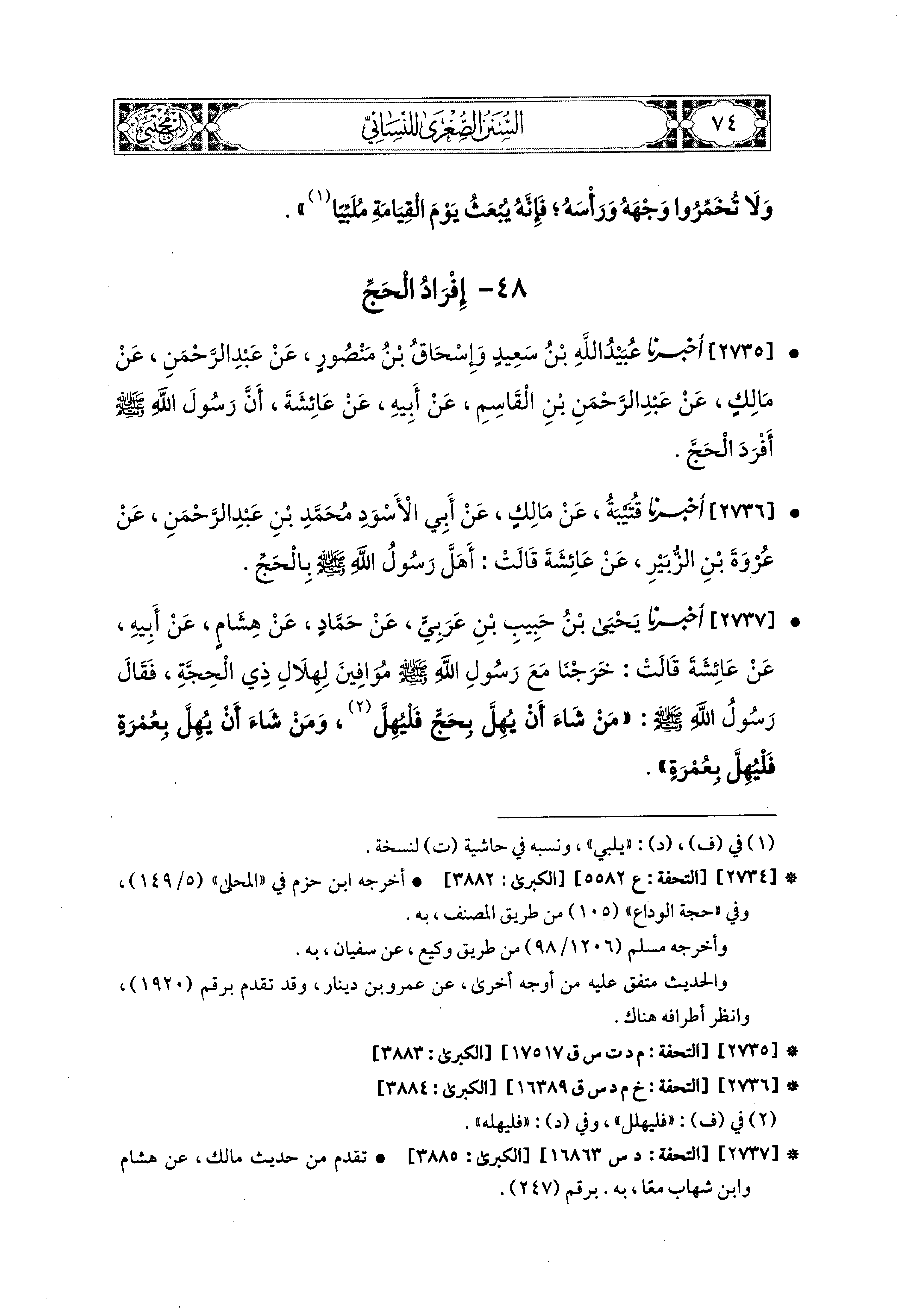 2735 - أَخبَرَنا عُبَيدُ اللهِ بْنُ سَعيدٍ، وَإِسحَاقُ بْنُ مَنْصُورٍ، عَن عَبدِ الرَّحمَنِ، عَن مَالِكٍ، عَن عَبدِ الرَّحمَنِ بْنِ القَاسِمِ، عَن أَبيهِ، عَن عَائِشَةَ، أَنَّ رَسُولَ اللهِ صَلى الله عَليه وسَلم أَفْرَدَ الحَجَّ.