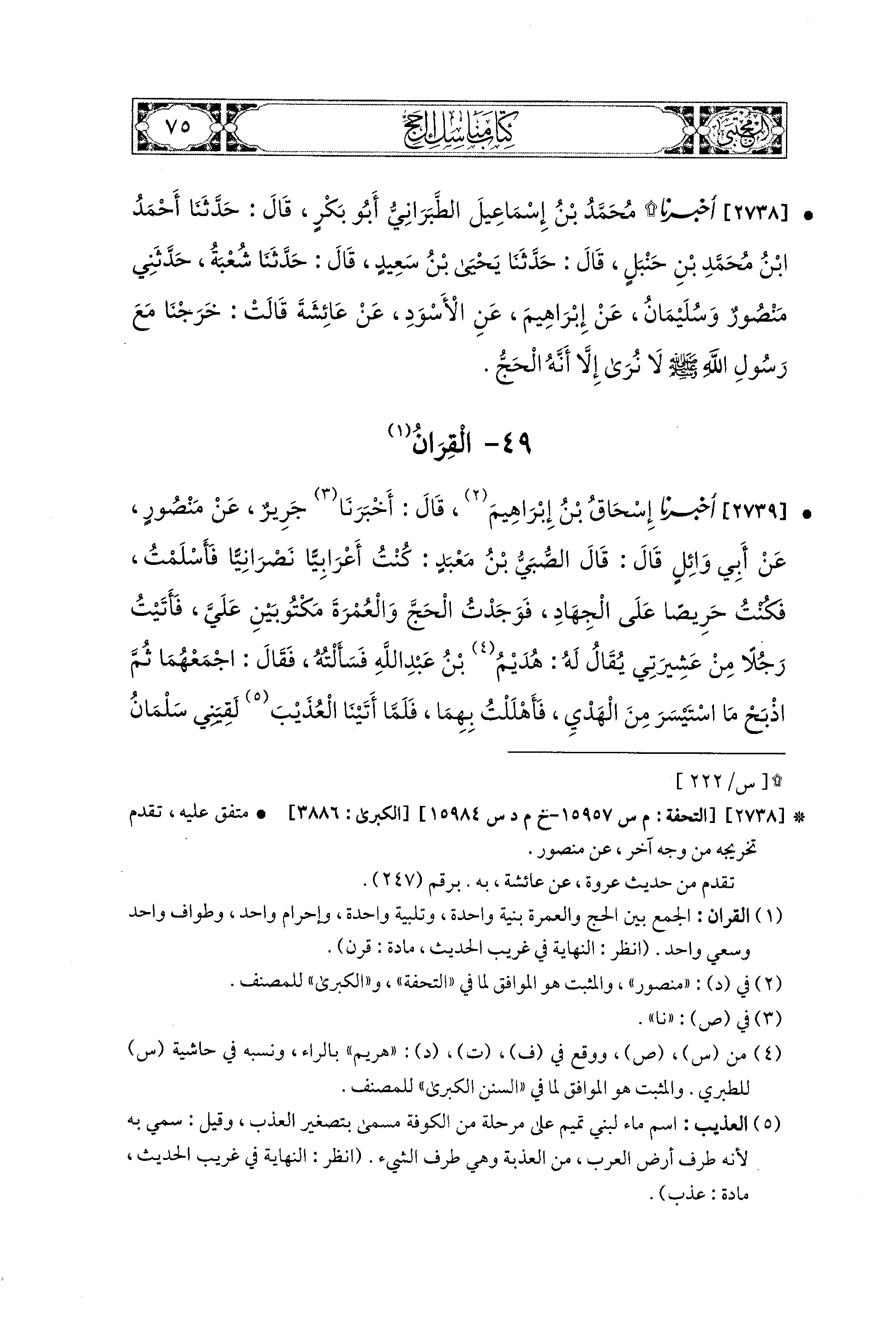 2739 - أَخبَرَنا إِسحَاقُ بْنُ إِبراهِيمَ، قَالَ: أَخبَرنا جَرِيرٌ، عَن مَنْصُورٍ، عَن أَبي وَائِلٍ، قَالَ: قَالَ الصُّبَيُّ بْنُ مَعْبَدٍ: كُنْتُ أَعْرَابيًّا نَصْرَانيًّا فَأَسْلَمْتُ، فَكُنْتُ حَرِيصًا عَلَى الجِهَادِ، فَوَجَدْتُ الحَجَّ وَالعُمْرَةَ مَكْتُوبَيْنِ عَلَيَّ، فَأَتَيْتُ رَجُلاً مِنْ عَشِيرَتِي يُقَالُ لَهُ هُدَيْمُ بْنُ عَبدِ اللهِ (1)، فَسَأَلْتُهُ فَقَالَ: اجْمَعْهُمَا، ثُمَّ اذْبَحْ مَا اسْتَيْسَرَ مِنَ الهَدْيِ، فَأَهْلَلْتُ بِهِمَا، فَلَمَّا أَتَيْنا العُذَيْبَ لَقِيَني سَلْمَانُ بْنُ رَبِيعَةَ وَزَيْدُ بْنُ صُوحَانَ، وَأَنَا أُهِلُّ بِهِمَا، فَقَالَ أَحَدُهُمَا لِلآخَرِ: مَا هَذَا بِأَفْقَهَ مِنْ بَعِيرِهِ، فَأَتَيْتُ عُمَرَ فَقُلْتُ: يَا أَميرَ المُؤْمِنينَ إِنِّي أَسْلَمْتُ، وَأَنَا حَرِيصٌ عَلَى الجِهَادِ، وَإِنِّي وَجَدْتُ الحَجَّ وَالعُمْرَةَ مَكْتُوبَيْنِ عَلَيَّ، فَأَتَيْتُ هُدَيْمُ بْنُ عَبدِ اللهِ (1)، فَقُلْتُ: يَا هَنَّاهُ، إِنِّي وَجَدْتُ الحَجَّ وَالعُمْرَةَ مَكْتُوبَيْنِ عَلَيَّ، فَقَالَ: اجْمَعْهُمَا، ثُمَّ اذْبَحْ مَا اسْتَيْسَرَ مِنَ الهَدْيِ، فَأَهْلَلْتُ بِهِمَا، فَلَمَّا أَتَيْتُ العُذَيْبَ لَقِيَني سَلْمَانُ بْنُ رَبِيعَةَ وَزَيْدُ بْنُ صُوحَانَ فَقَالَ أَحَدُهُمَا لِلآخَرِ: مَا هَذَا بِأَفْقَهَ مِنْ بَعِيرِهِ، فَقَالَ عُمَرُ: هُدِيتَ لِسُنَّةِ نَبِيِّكَ صَلى الله عَليه وسَلم.