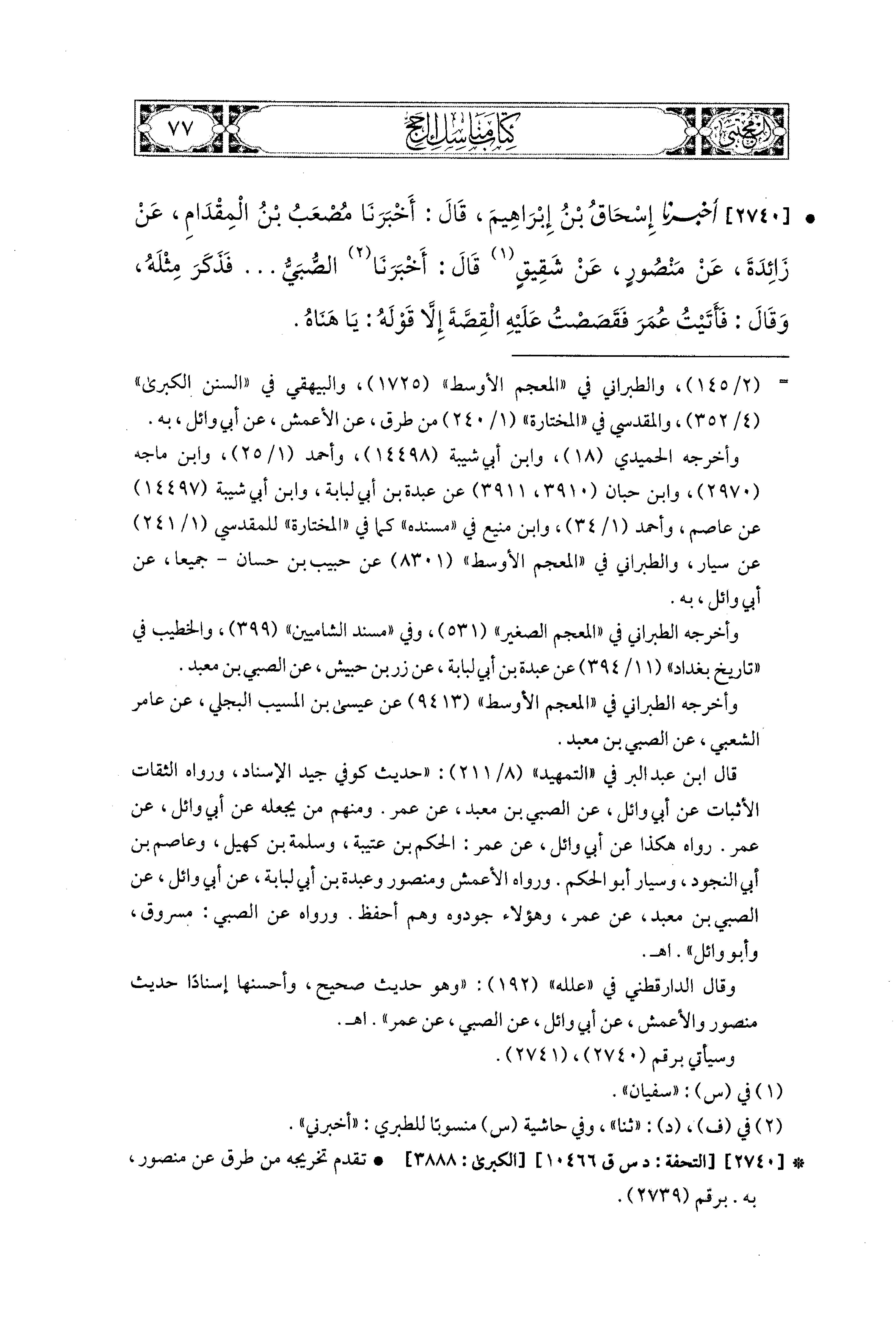 2740 - أَخبَرَنا إِسحَاقُ بْنُ إِبراهِيمَ، قَالَ: أَخبَرنا مُصْعَبُ بْنُ المِقْدَامِ، عَن زِائِدَةَ، عَن مَنْصُورٍ، عَن شَقِيقٍ، قَالَ: أَخبَرنا الصُّبَيُّ ... فَذَكَرَ مِثْلَهُ، وقَالَ: فَأَتَيْتُ عُمَرَ فَقَصَصْتُ عَلَيهِ القِصَّةَ إِلاَّ قَوْلَهُ يَا هَنَّاهُ.