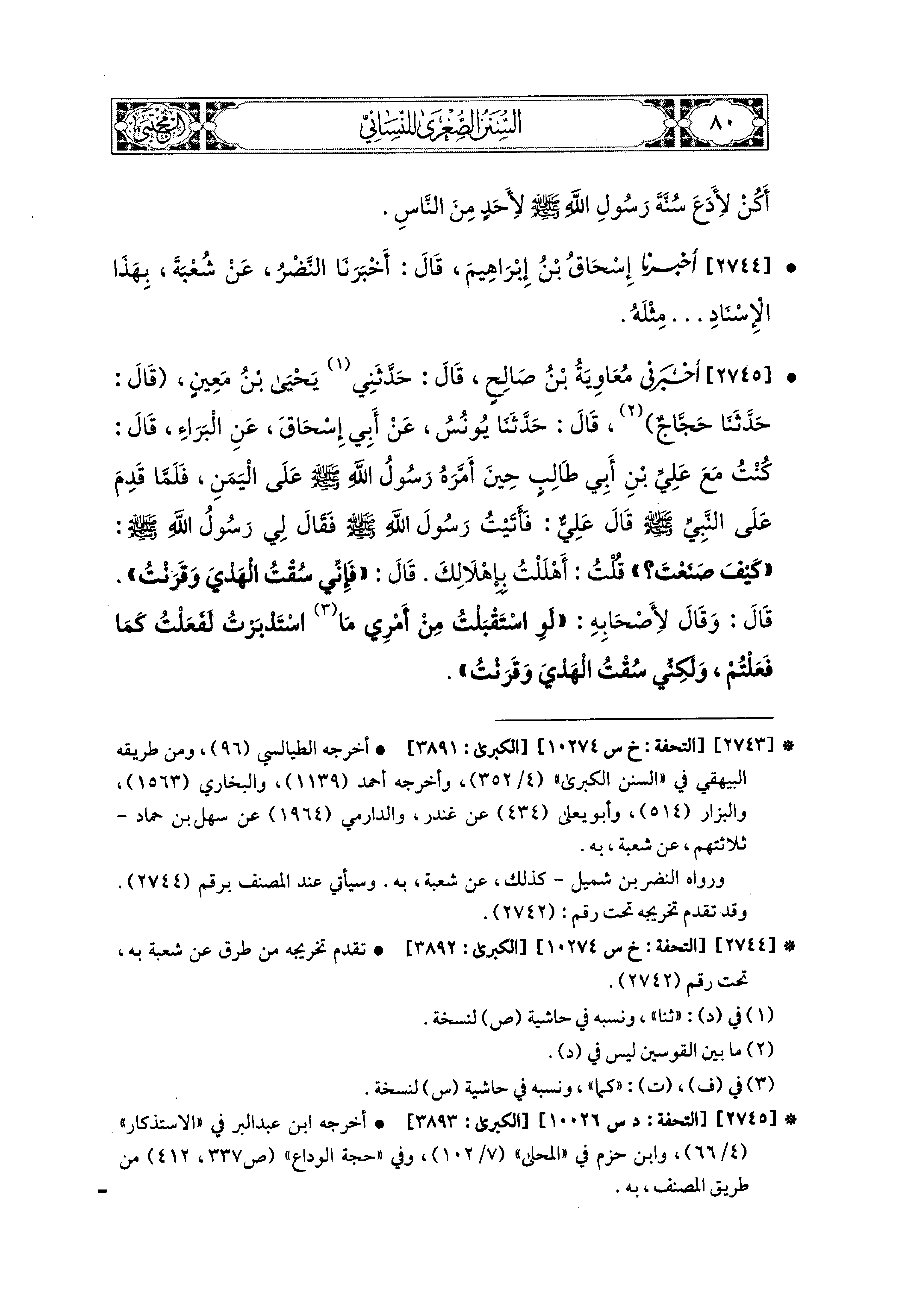 2745 - أَخبَرني مُعَاوِيَةُ بْنُ صَالِحٍ، قَالَ: حَدَّثَني يَحيَى بْنُ مَعِينٍ، قال: حَدثنا حَجَّاجٌ، قال: حَدثنا يُونُسُ، عَن أَبي إِسحَاقَ، عَنِ البَرَاءِ، قَالَ: كُنْتُ مَعَ عَلِيِّ بْنِ أَبي طَالِبٍ حِينَ أَمَّرَهُ رَسُولُ اللهِ صَلى الله عَليه وسَلم عَلَى اليَمَنِ، فَلَمَّا قَدِمَ عَلَى النَّبيِّ صَلى الله عَليه وسَلم قَالَ عَلِيٌّ: فَأَتَيْتُ رَسُولَ اللهِ صَلى الله عَليه وسَلم، فَقَالَ لِي رَسُولُ اللهِ صَلى الله عَليه وسَلم: كَيْفَ صَنَعْتَ؟ قُلْتُ: أَهْلَلْتُ بِإِهْلاَلِكَ، قَالَ: فَإِنِّي سُقْتُ الهَدْيَ، وَقَرَنْتُ، قَالَ: وَقَالَ صَلى الله عَليه وسَلم لأَصْحَابِهِ: لَوِ اسْتَقْبَلْتُ مِنْ أَمْرِي، مَا اسْتَدْبَرْتُ لَفَعَلْتُ كَمَا فَعَلْتُمْ، وَلَكِنِّي سُقْتُ الهَدْيَ، وَقَرَنْتُ.