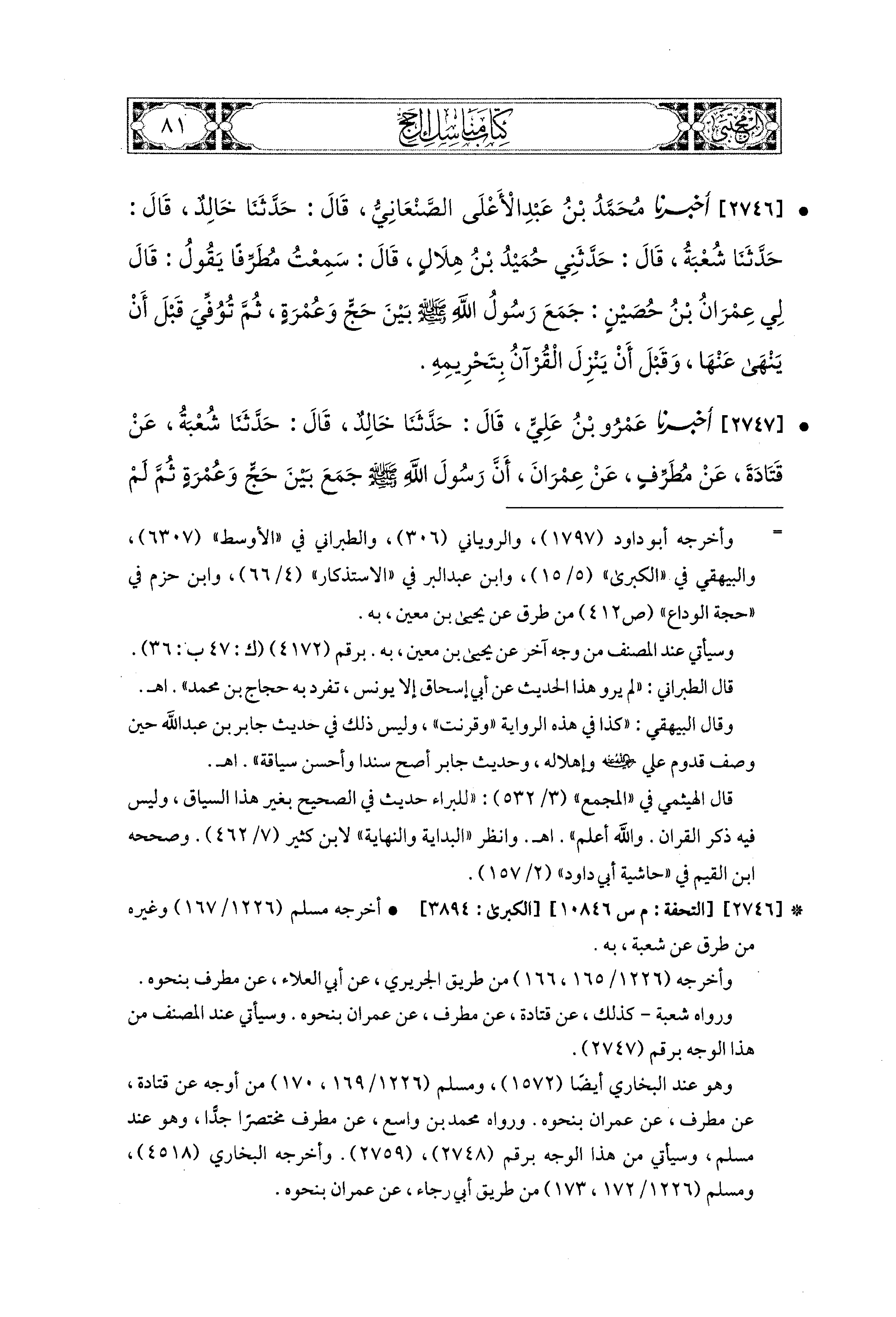2746 - أَخبَرَنا مُحَمد بن عَبدِ الأَعلَى الصَّنْعَانيُّ، قال: حَدثنا خَالِدٌ، قال: حَدثنا شُعبَةُ، قَالَ: حَدَّثَني حُمَيدُ بْنُ هِلاَلٍ، قَالَ: سَمِعْتُ مُطَرِّفًا، يَقُولُ: قَالَ لِي عِمْرَانُ بْنُ حُصَيْنٍ: جَمَعَ رَسُولُ اللهِ صَلى الله عَليه وسَلم بَيْنَ حَجٍّ وَعُمْرَةٍ، ثُمَّ تُوُفِّيَ قَبْلَ أَنْ يَنْهَى عَنهَا، وَقَبْلَ أَنْ يَنْزِلَ القُرْآنُ بِتَحْرِيمِهِ.