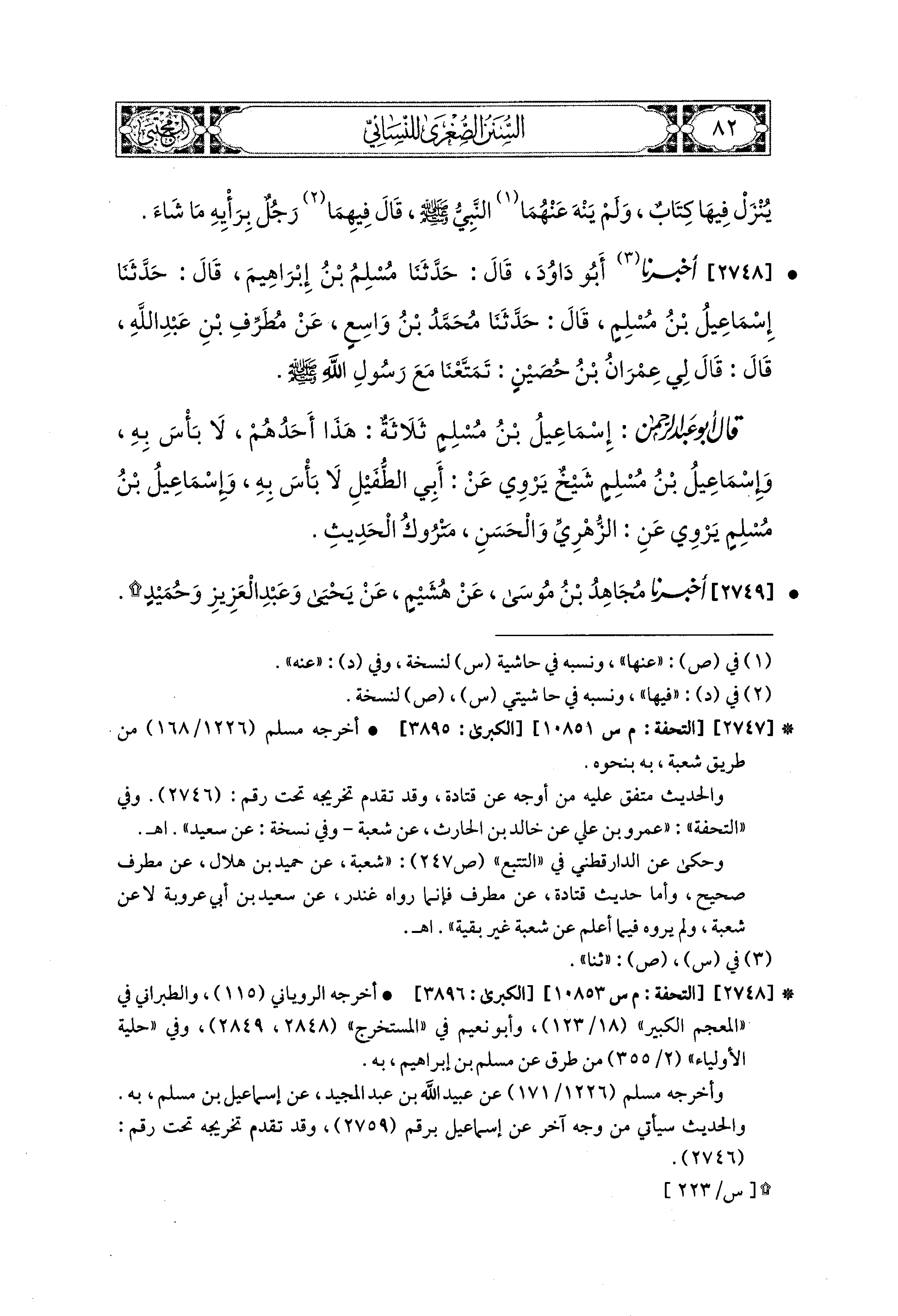 2748 - أَخبَرَنا أَبو دَاوُدَ، قال: حَدثنا مُسْلِمُ بْنُ إِبراهِيمَ، قال: حَدثنا إِسماعِيلُ بْنُ مُسْلِمٍ، قال: حَدثنا مُحَمدُ بْنُ وَاسِعٍ، عَن مُطَرِّفِ بْنِ عَبدِ اللهِ، قَالَ: قَالَ لِي عِمْرَانُ بْنُ حُصَيْنٍ: تَمَتَّعْنَا مَعَ رَسُولِ اللهِ صَلى الله عَليه وسَلم.