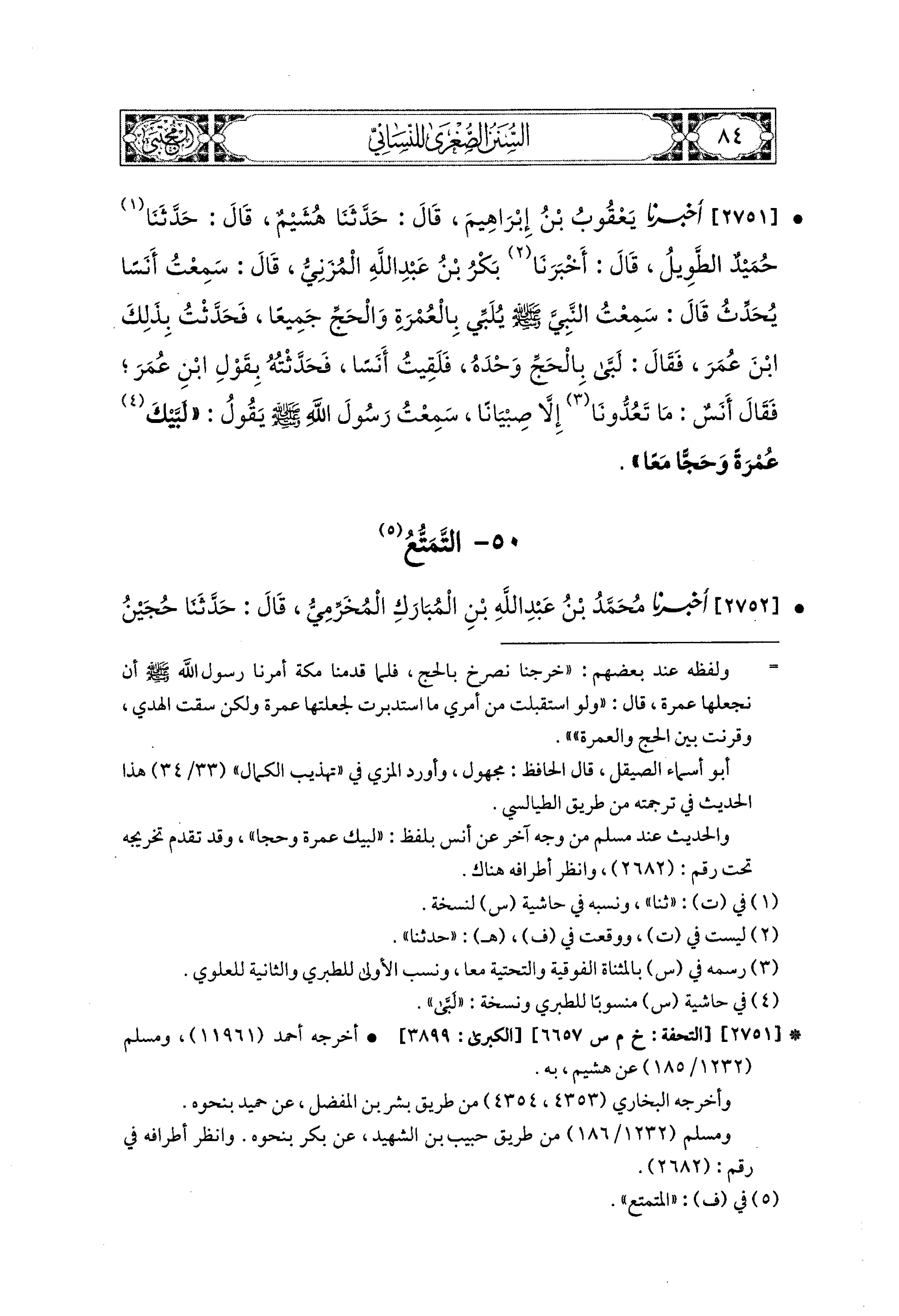 2751 - أَخبَرَنا يَعقُوبُ بْنُ إِبراهِيمَ، قال: حَدثنا هُشَيْمٌ، قال: حَدثنا حُمَيدٌ الطَّوِيلُ، قَالَ: أَخبَرنا بَكْرُ بْنُ عَبدِ اللهِ المُزَنيُّ، قَالَ: سَمِعْتُ أَنَسًا، يُحَدِّثُ، قَالَ: سَمِعْتُ النَّبيَّ صَلى الله عَليه وسَلم يُلَبِّي بِالعُمْرَةِ وَالحَجِّ جَميعًا، فَحَدَّثْتُ بِذَلِكَ ابنَ عُمَرَ، فَقَالَ: لَبَّى بِالحَجِّ وَحْدَهُ، فَلَقِيتُ أَنَسًا فَحَدَّثْتُهُ بِقَوْلِ ابنِ عُمَرَ، فَقَالَ أَنَسٌ: مَا تَعُدُّونَا إِلاَّ صِبْيَانًا، سَمِعْتُ رَسُولَ اللهِ صَلى الله عَليه وسَلم يَقُولُ: لَبَّيْكَ عُمْرَةً، وَحَجًّا مَعًا.