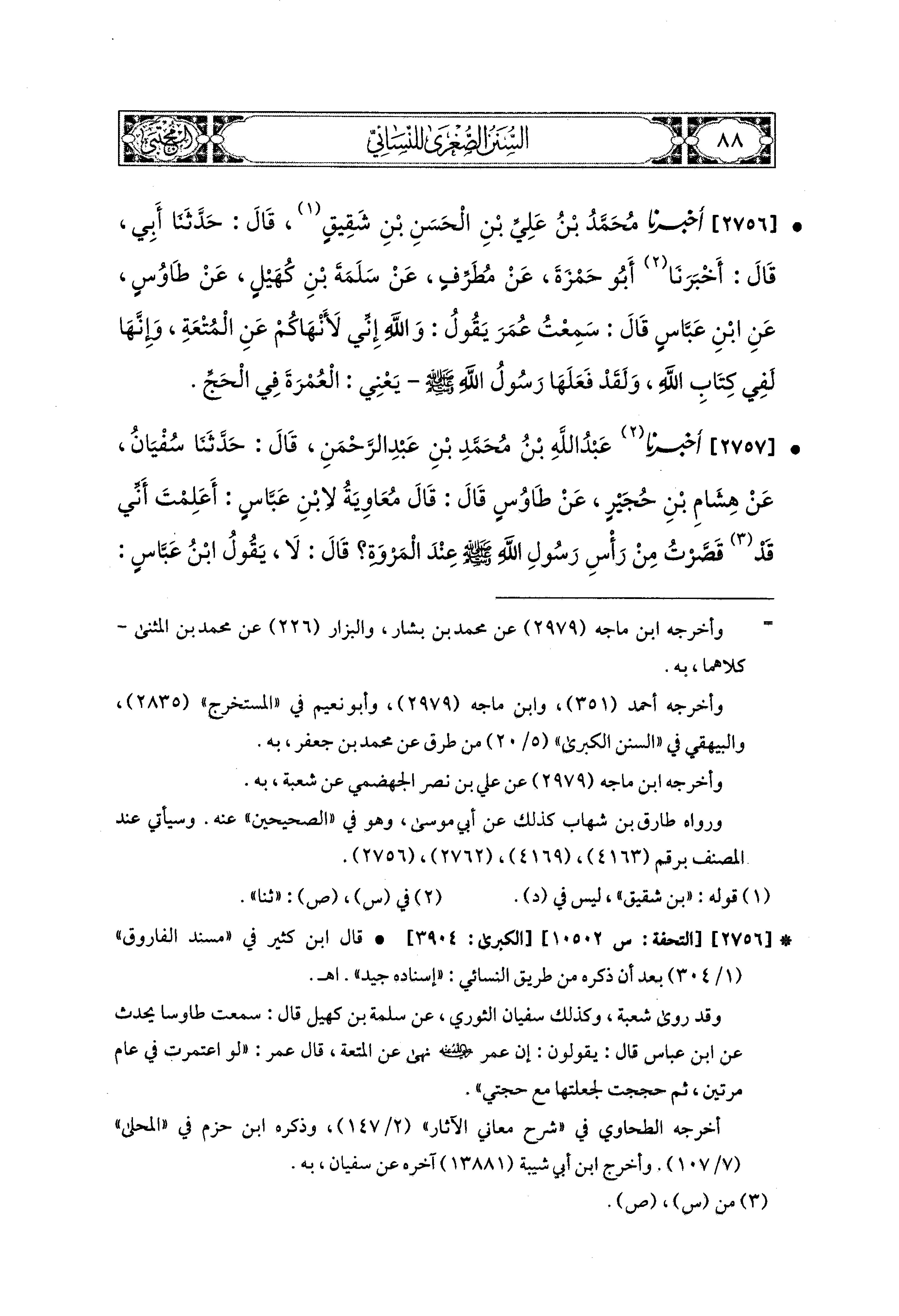 2757 - أَخبَرَنا عَبدُ اللهِ بْنُ مُحَمدِ بْنِ عَبدِ الرَّحمَنِ، قال: حَدثنا سُفيَانُ، عَن هِشَامِ بْنِ حُجَيْرٍ، عَن طَاوُوسٍ، قَالَ: قَالَ مُعَاوِيَةُ لاِبْنِ عَبَّاسٍ: أَعَلِمْتَ أَنِّي قد قَصَّرْتُ مِنْ رَأْسِ رَسُولِ اللهِ صَلى الله عَليه وسَلم عِنْدَ المَرْوَةِ؟ قَالَ: لاَ، يَقُولُ ابنُ عَبَّاسٍ: هَذَا مُعَاوِيَةُ يَنْهَى النَّاسَ عَنِ المُتْعَةِ، وَقَدْ تَمَتَّعَ النَّبيُّ صَلى الله عَليه وسَلم.