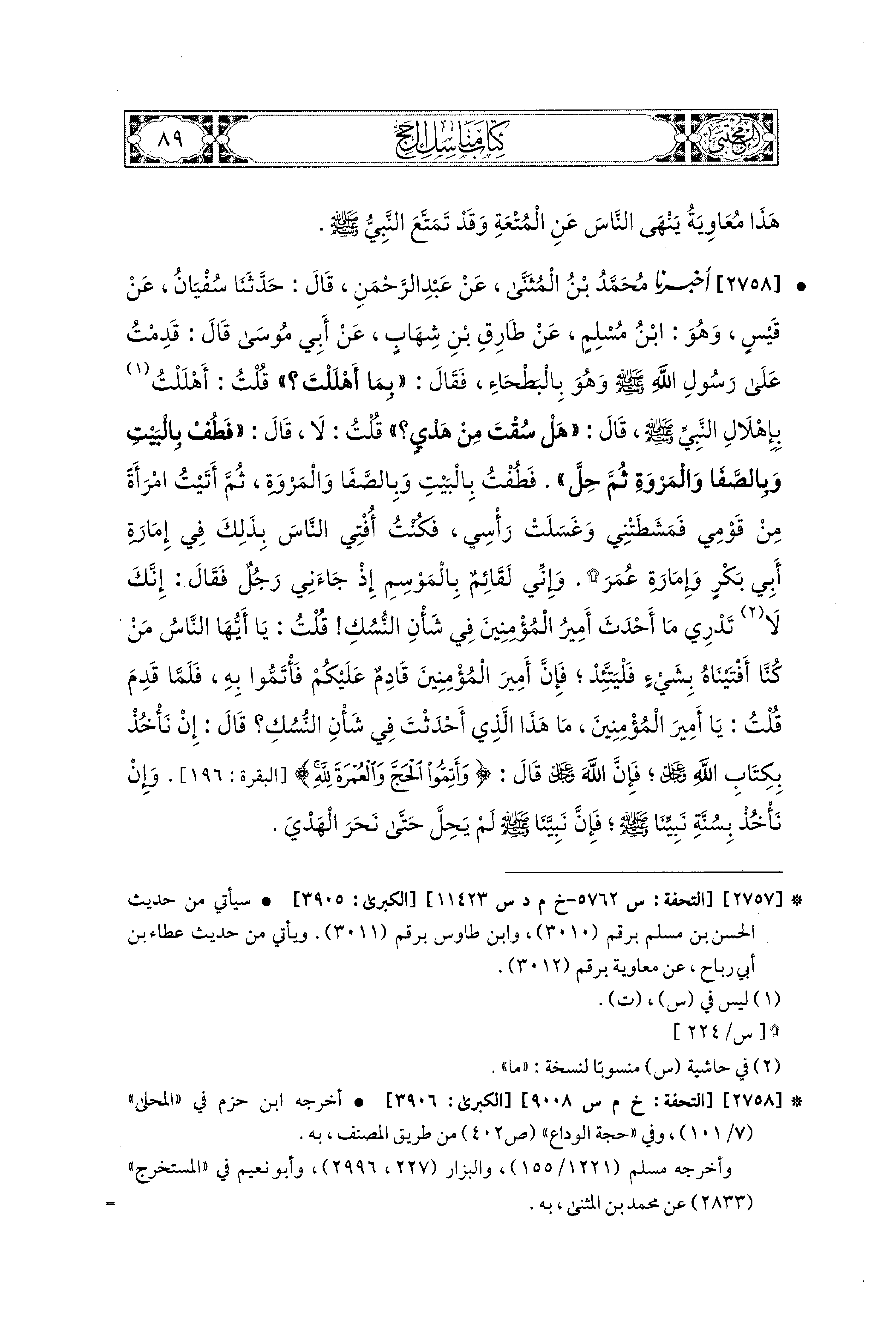 2758 - أَخبَرَنا مُحَمد بْنُ المُثَنَّى، عَن عَبدِ الرَّحمَنِ، قال: حَدثنا سُفيَانُ، عَن قَيْسٍ، وَهُوَ ابنُ مُسْلِمٍ، عَن طَارِقِ بْنِ شِهَابٍ، عَن أَبي مُوسَى، قَالَ: قَدِمْتُ عَلَى رَسُولِ اللهِ صَلى الله عَليه وسَلم وَهُوَ بِالبَطْحَاءِ، فَقَالَ: بِمَا أَهْلَلْتَ؟ قُلْتُ: أَهْلَلْتُ بِإِهْلاَلِ النَّبيِّ صَلى الله عَليه وسَلم قَالَ: هَلْ سُقْتَ مِنْ هَدْيٍ؟ قُلْتُ: لاَ، قَالَ: فَطُفْ بِالبَيْتِ وَبِالصَّفَا وَالمَرْوَةِ، ثُمَّ حِلَّ، فَطُفْتُ بِالبَيْتِ وَبِالصَّفَا وَالمَرْوَةِ، ثُمَّ أَتَيْتُ امْرَأَةً مِنْ قَوْمي فَمَشَطَتْني، وَغَسَلَتْ رَأْسِي، فَكُنْتُ أُفْتِي النَّاسَ بِذَلِكَ فِي إِمَارَةِ أَبي بَكْرٍ، وَإِمَارَةِ عُمَرَ، وَإِنِّي لَقَائِمٌ بِالمَوْسِمِ إِذْ جَاءَني رَجُلٌ، فَقَالَ: إِنَّكَ لاَ تَدْرِي مَا أَحْدَثَ أَميرُ المُؤْمِنينَ فِي شَأْنِ النُّسُكِ، قُلْتُ: يَا أَيُّهَا النَّاسُ مَنْ كُنَّا أَفْتَيْنَاهُ بِشَيْءٍ فَلْيَتَّئِدْ، فَإِنَّ أَميرَ المُؤْمِنينَ قَادِمٌ عَلَيْكُمْ، فَأْتَمُّوا بِهِ، فَلَمَّا قَدِمَ، قُلْتُ: يَا أَميرَ المُؤْمِنينَ مَا هَذَا الَّذِي أَحْدَثْتَ فِي شَأْنِ النُّسُكِ؟ قَالَ: إِنْ نَأْخُذْ بِكِتَابِ اللهِ عَزَّ وَجَلَّ، فَإِنَّ اللهَ عَزَّ وَجَلَّ قَالَ: {وَأَتِمُّوا الحَجَّ وَالعُمْرَةَ لِلَّهِ} وَإِنْ نَأْخُذْ بِسُنَّةِ نَبِيِّنَا صَلى الله عَليه وسَلم فَإِنَّ نَبِيَّنَا صَلى الله عَليه وسَلم لَمْ يَحِلَّ حَتَّى نَحَرَ الهَدْيَ.