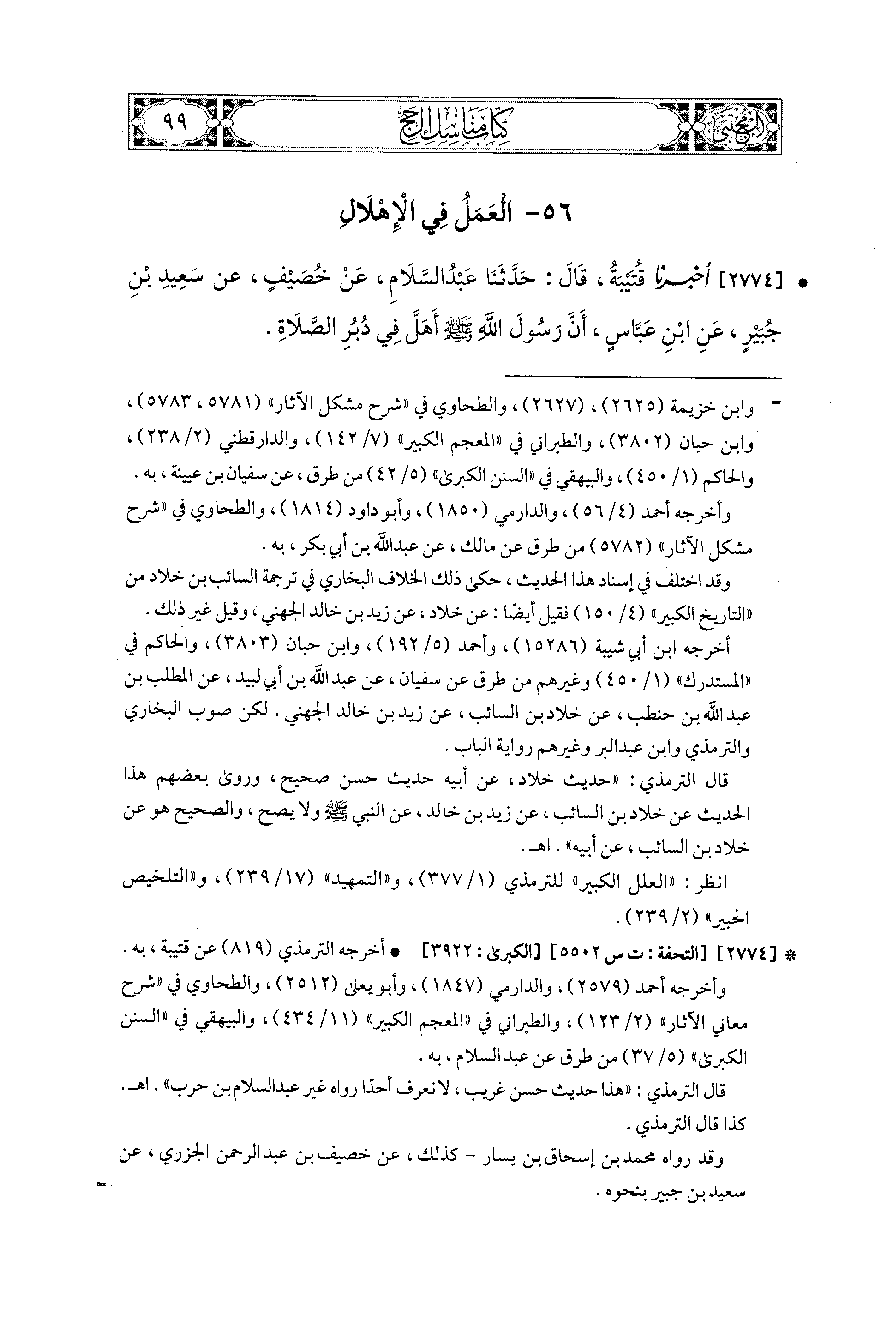 2774 - أَخبَرَنا قُتَيبَةُ، قال: حَدثنا عَبدُ السَّلاَمِ، عَن خُصَيْفٍ، عَن سَعيدِ بْنِ جُبَيْرٍ، عَنِ ابنِ عَبَّاسٍ، أَنَّ رَسُولَ اللهِ صَلى الله عَليه وسَلم أَهَلَّ فِي دُبُرِ الصَّلاَةِ.