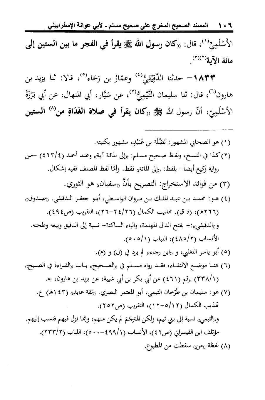 1833 - حدثنا الدَّقِيْقِيُّ (¬1) وعمّارُ بن رَجَاء (¬2)، قالا: ثنا يزيد بن هارون (¬3)، قال: ثنا سليمان التَّيْمِيُّ (¬4)، عن سَيَّار، أبي المنهال، عن أبي بَرْزَةَ الأسْلَمِيّ، أنّ رسول الله -صلى الله عليه وسلم- "كان يقرأ في صلاة الغَدَاةِ من (¬5) الستين
