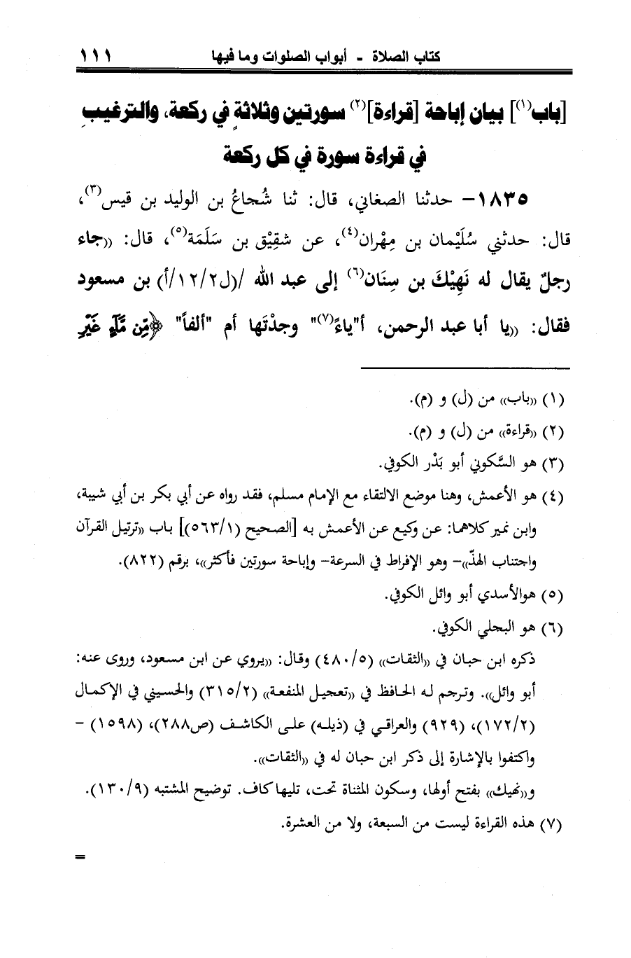 (¬2) هو الأعمش، وهنا موضع الالتقاء مع الإمام مسلم، ففد رواه عن أبي بكر بن أبي شيبة، وابن نمير كلاهما: عن وكيع عن الأعمش به [الصحيح (1/ 563)] باب "ترتيل القرآن واجتناب الهذّ" -وهو الإفراط في السرعة- وإباحة سورتين فأكثر"، برقم (822).