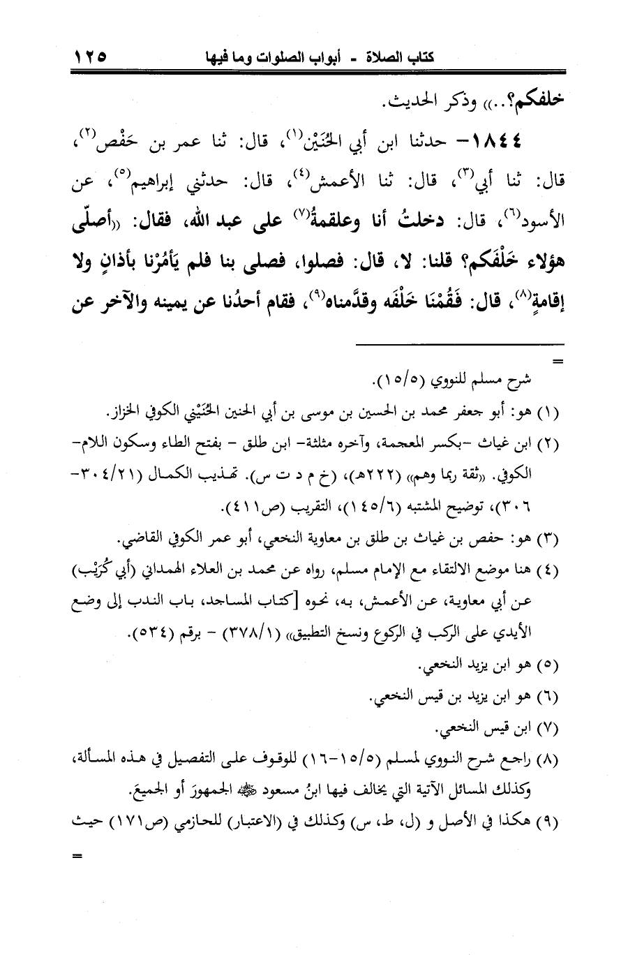 1844 - حدثنا ابن أبي الحُنَيْن (¬1)، قال: ثنا عمر بن حَفْص (¬2)، قال: ثنا أبي (¬3)، قال: ثنا الأعمش (¬4)، قال: حدثني إبراهيم (¬5)، عن الأسود (¬6)، قال: دخلتُ أنا وعلقمةُ (¬7) على عبد الله، فقال: "أصلّى هؤلاء خَلْفَكم؟ قلنا: لا، قال: فصلوا، فصلى بنا فلم يَأمُرْنا بأذانٍ ولا إقامةٍ (¬8)، قال: فَقُمْنَا خَلْفَه وقدَّمناه (¬9)، فقام أحدُنا عن يمينه والآخر عن