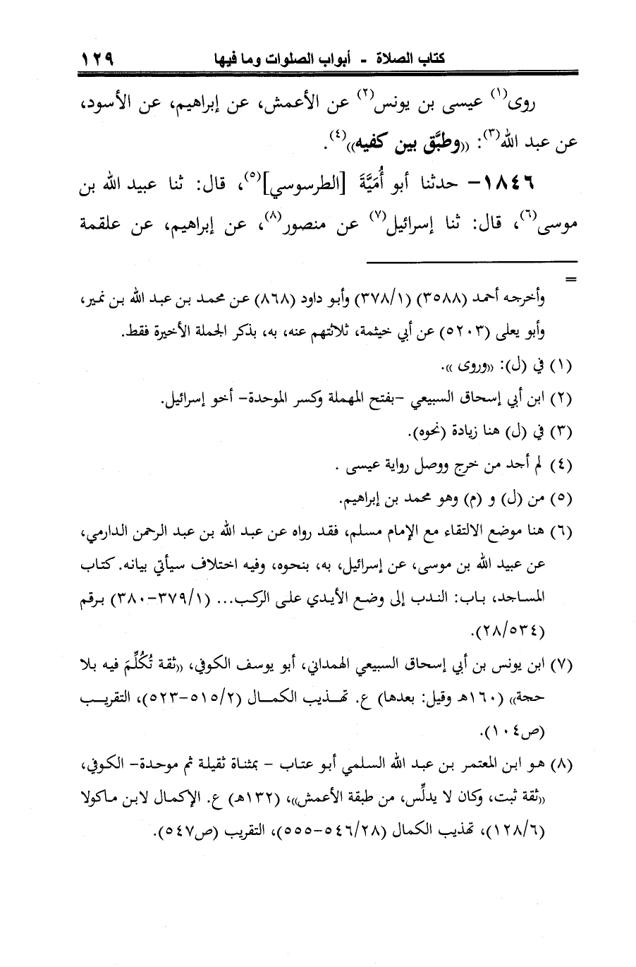 (¬2) هنا موضع الالتقاء مع الإمام مسلم، فقد رواه عن عبد الله بن عبد الرحمن الدارمي، عن عبيد الله بن موسى، عن إسرائيل، به، بنحوه، وفيه اختلاف سيأتي بيانه. كتاب المساجد، باب: الندب إلى وضع الأيدي على الركب. . . (1/ 379 - 380) برقم (534/ 28).