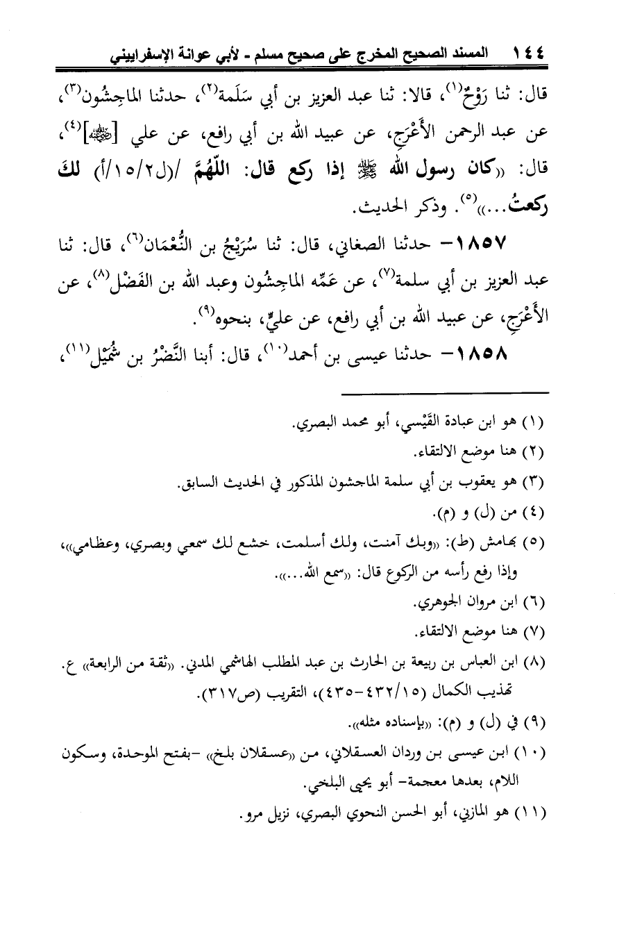 1857 - حدثنا الصغاني، قال: ثنا سُرَيْجُ بن النُّعْمَان (¬1)، قال: ثنا عبد العزيز بن أبي سلمة (¬2)، عن عَمِّه الماجِشمُون وعبد الله بن الفَضْل (¬3)، عن الأَعْرَجِ، عن عبيد الله بن أبي رافع، عن علي، بنحوه (¬4).