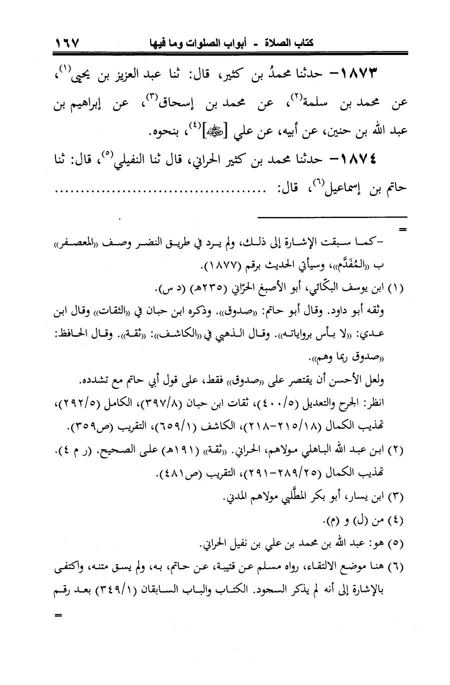 1873 - حدثنا محمدُ بن كثير، قال: ثنا عبد العزيز بن يحيى (¬1)، عن محمد بن سلمة (¬2)، عن محمد بن إسحاق (¬3)، عن إبراهيم بن عبد الله بن حنين، عن أبيه، عن علي [-رضي الله عنه-] (¬4)، بنحوه.