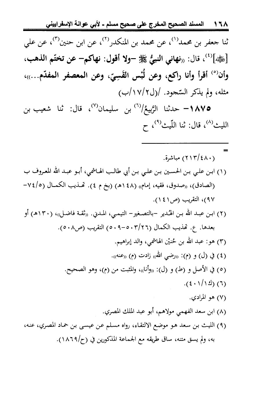 -[169]- وحدثنا عبّاس (¬5)، قال: ثنا يونس بن محمد (¬6)، قال: ثنا اللّيث، عن يزيد بن أبي حبيب (¬7)، أنّ إبراهيم بن عبد الله بن حُنيْن [حدثه] (¬8)، أنّ أباه حدّثه، [أنه] سمع من عليّ [-رضي الله عنه-] يقول: "نهى النبيُّ -صلى الله عليه وسلم- عن خاتَمِ الذَّهبِ، ولَبوس (¬9) القَسِيّ، والمعَصْفَر (¬10)، وقراءةِ القرآن وأنا راكعٌ"، ولم يذكر السُّجودَ.