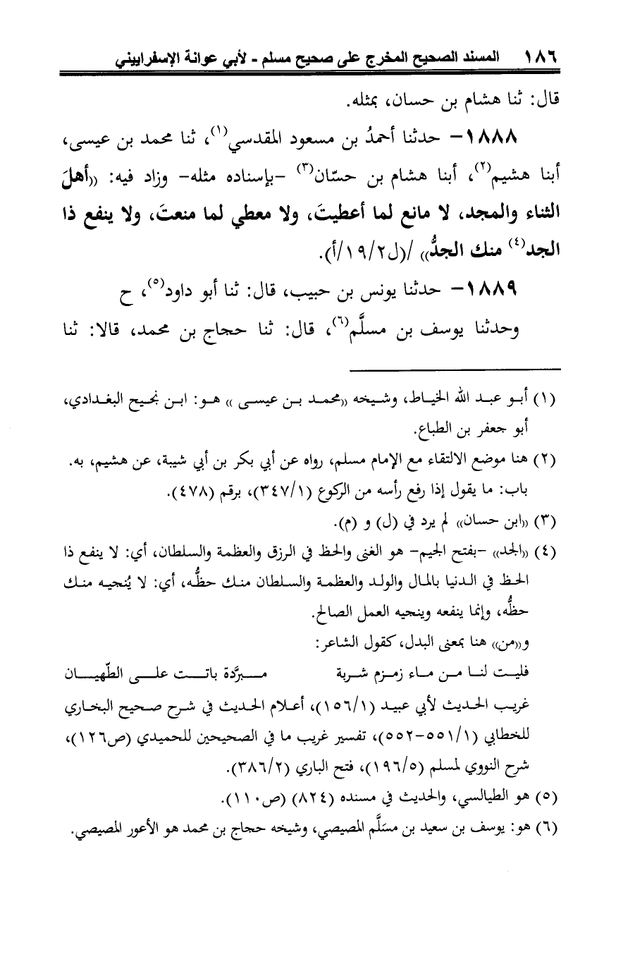 1888 - حدثنا أحمدُ بن مسعود المقدسي (¬1)، ثنا محمد بن عيسى، أبنا هشيم (¬2)، أبنا هشام بن حسّان (¬3) -بإسناده مثله- وزاد فيه: "أهلَ الثناء والمجد، لا مانع لما أعطيتَ، ولا معطي لما منعتَ، ولا ينفع ذا الجد (¬4) منك الجدُّ".