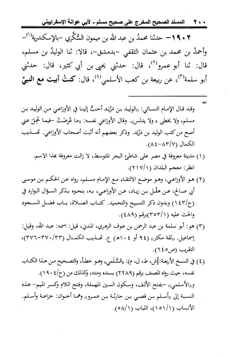 1902 - حدثنا محمدُ بن عبد الله بن ميمون السُّكَّري -بالإسكندرية (¬1) - وأحمدُ بن محمد بن عثمان الثقفي -بدمشق-، قالا: ثنا الوليدُ بن مسلم، قال: ثنا أَبو عمرو (¬2)، قال: حدثني يحيى بن أبي كثير، قال: حدثني أَبو سلمة (¬3)، عن ربيعة بن كعب الأسلمي (¬4)، قال: كنتُ أبيت مع النبيِّ