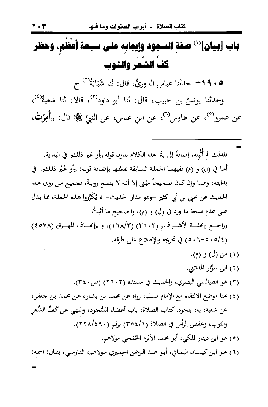 (¬3) هنا موضع الالتقاء مع الإمام مسلم، رواه عن محمد بن بشار، عن محمد بن جعفر، عن شعبة، به، بنحوه. كتاب الصلاة، باب أعضاء السُّجود، والنهي عن كَفِّ الشَّعْرِ والثوبِ، وعفص الرأس في الصلاة (1/ 354) برقم (490/ 228).