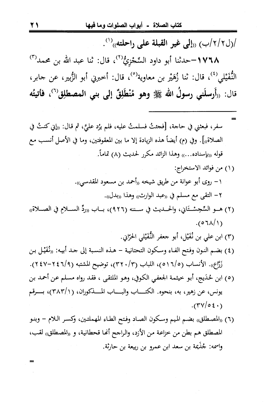 1768 - حدثنا أَبو داود السِّجْزِيُّ (¬1)، قال: ثنا عبد الله بن محمد (¬2) النُّفَيْلي (¬3)، قال: ثنا زُهَيْر بن معاوية (¬4)، قال: أخبرني أَبو الزُّبير، عن جابر، قال: "أَرسلَني رسولُ الله -صلى الله عليه وسلم- وهو مُنْطَلِقٌ إلى بني المصطلِق (¬5)، فأتيتُه