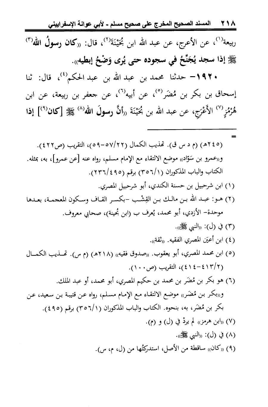 1920 - حدثنا محمد بن عبد الله بن عبد الحكم (¬1)، قال: ثنا إسحاق بن بكر بن مُضَر (¬2)، عن أبيه (¬3)، عن جعفر بن ربيعة، عن ابن هُرْمُزٍ (¬4) الأَعْرَجِ، عن عبد الله بن بُحَيْنَةَ "أنَّ رسولَ الله (¬5) -صلى الله عليه وسلم-[كان (¬6)] إذا